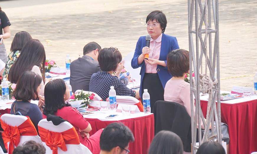 TS. Phạm Thu Hương - Trưởng phòng Quản lý đào tạo giải đáp thắc mắc và tư vấn tuyển sinh cho các em học sinh