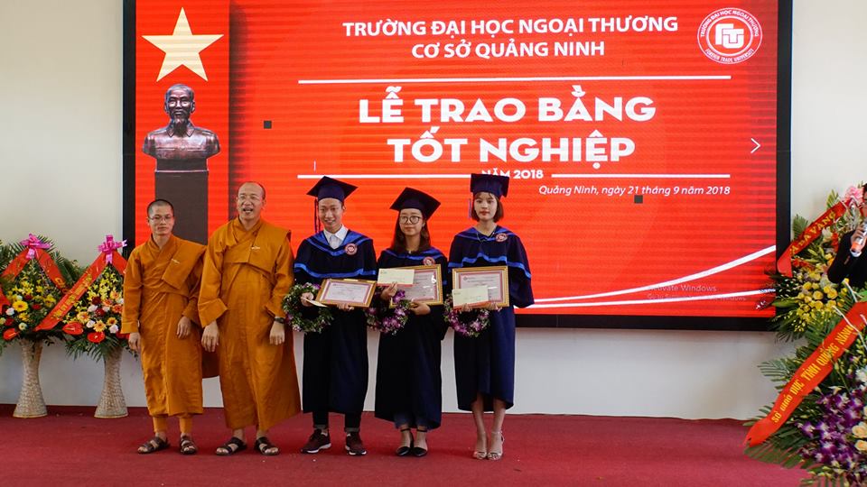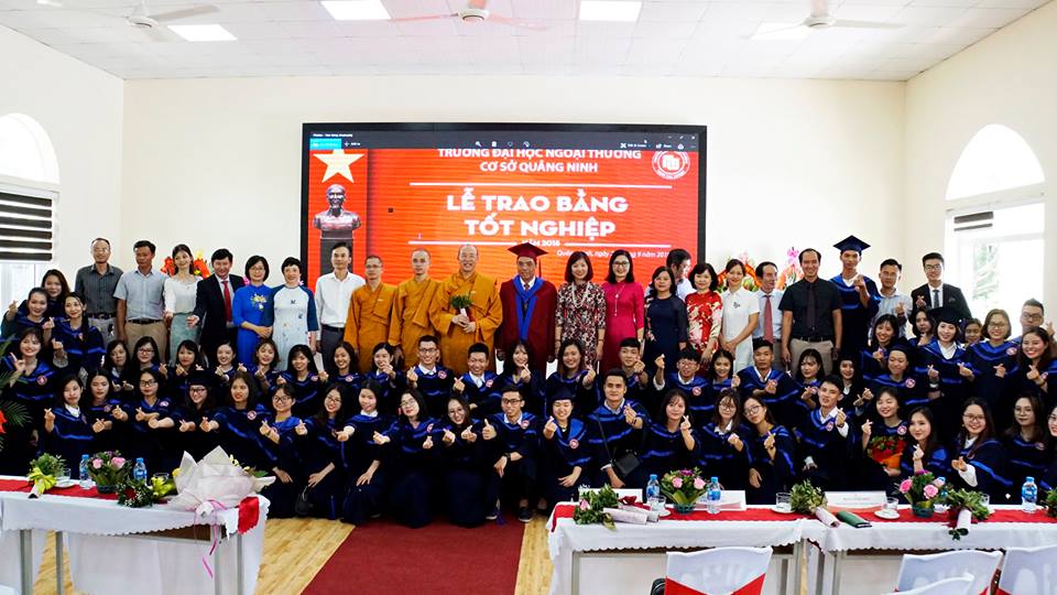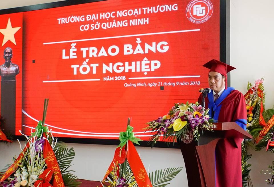 Tiếp đó, ngày 21/09/2018, Cơ sở Quảng Ninh cũng đã trang trọng tổ chức lễ trao bằng tốt nghiệp năm 2018 cho sinh viên bậc cử nhân hệ đào tạo chính quy ở các chuyên ngành đào tạo. Đến tham dự buổi lễ về phía khách mời có Đại đức Thích Trúc Thái Minh – Phó trưởng ban Thông tin truyền thông Trung ương Giáo hội Phật giáo Việt Nam, Trụ trì chùa Ba Vàng (Quảng Ninh); ông Ngô Văn Hợi – Phó Giám đốc Sở Giáo dục và Đào tạo tỉnh Quảng Ninh; ông Lê Hùng Sơn – Bí thư Tỉnh đoàn Quảng Ninh cùng đại diện các cơ quan, tổ chức và doanh nghiệp trên địa bàn tỉnh Quảng Ninh. Về phía Nhà trường có PGS, TS Bùi Anh Tuấn – Bí thư Đảng ủy, Hiệu trưởng Nhà trường, PGS, TS Đào Thị Thu Giang – Phó Bí thư Đảng ủy, Phó Hiệu trưởng, PGS, TS Lê Thị Thu Thủy - Ủy viên BTV Đảng ủy, Phó Hiệu trưởng, TS. Nguyễn Phúc Hiền – Giám đốc Cơ sở Quảng Ninh, lãnh đạo một số đơn vị, cán bộ, giảng viên Nhà trường, lãnh đạo các ban và cán bộ, viên chức Cơ sở Quảng Ninh cùng 120 tân cử nhân, quý vị phụ huynh và gia đình.