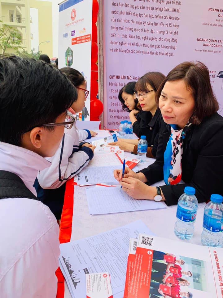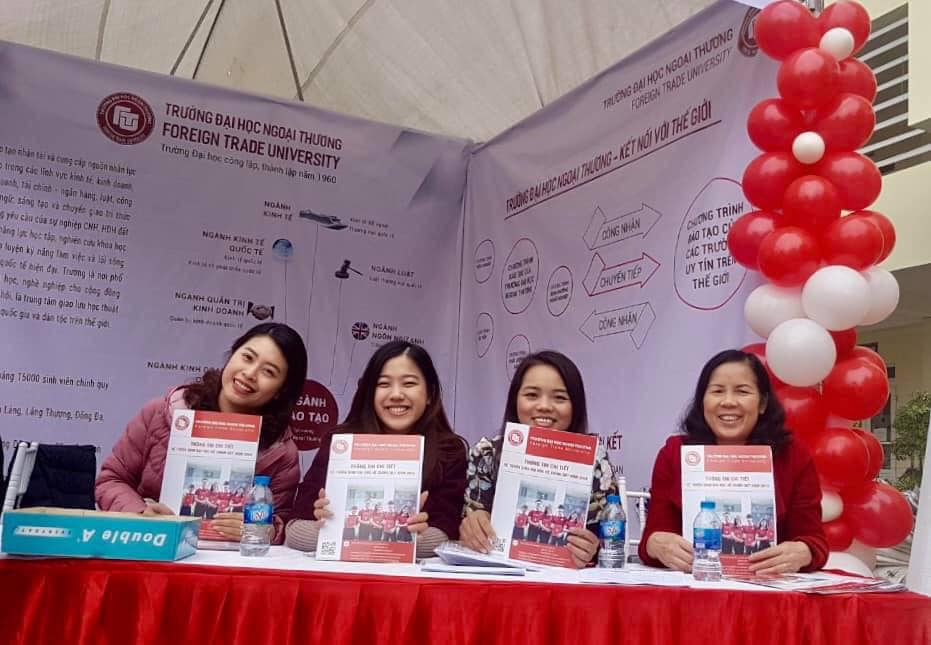 Hoà trong không khí sôi động, náo nức đó, gian trại tư vấn tuyển sinh của trường Đại học Ngoại thương cũng không kém phần hấp dẫn khi có rất đông đảo các bạn học sinh và phụ huynh các em đến để tìm hiểu và lắng nghe tư vấn bổ ích từ các thầy cô giáo của nhà trường để định hướng lựa chọn ngành cũng như chuyên ngành đào tạo phù hợp với bản thân. Trong số đó có rất đông các bạn bày tỏ đã dành tình cảm yêu thích và tìm hiểu về trường đã lâu. Các bạn vô cùng yêu thích màu đỏ trắng truyền thống của FTU và vô cùng ấn tượng với gian trại rất rực rỡ của trường. Các bạn cũng đã thể hiện sự ngưỡng mộ với các anh chị sinh viên tài năng của FTU cũng như danh tiếng hàng đầu và môi trường đào tạo chuyên nghiệp, chất lượng cao cũng như môi trường hoạt động năng động, hiện đại, sáng tạo và trẻ trung của trường.