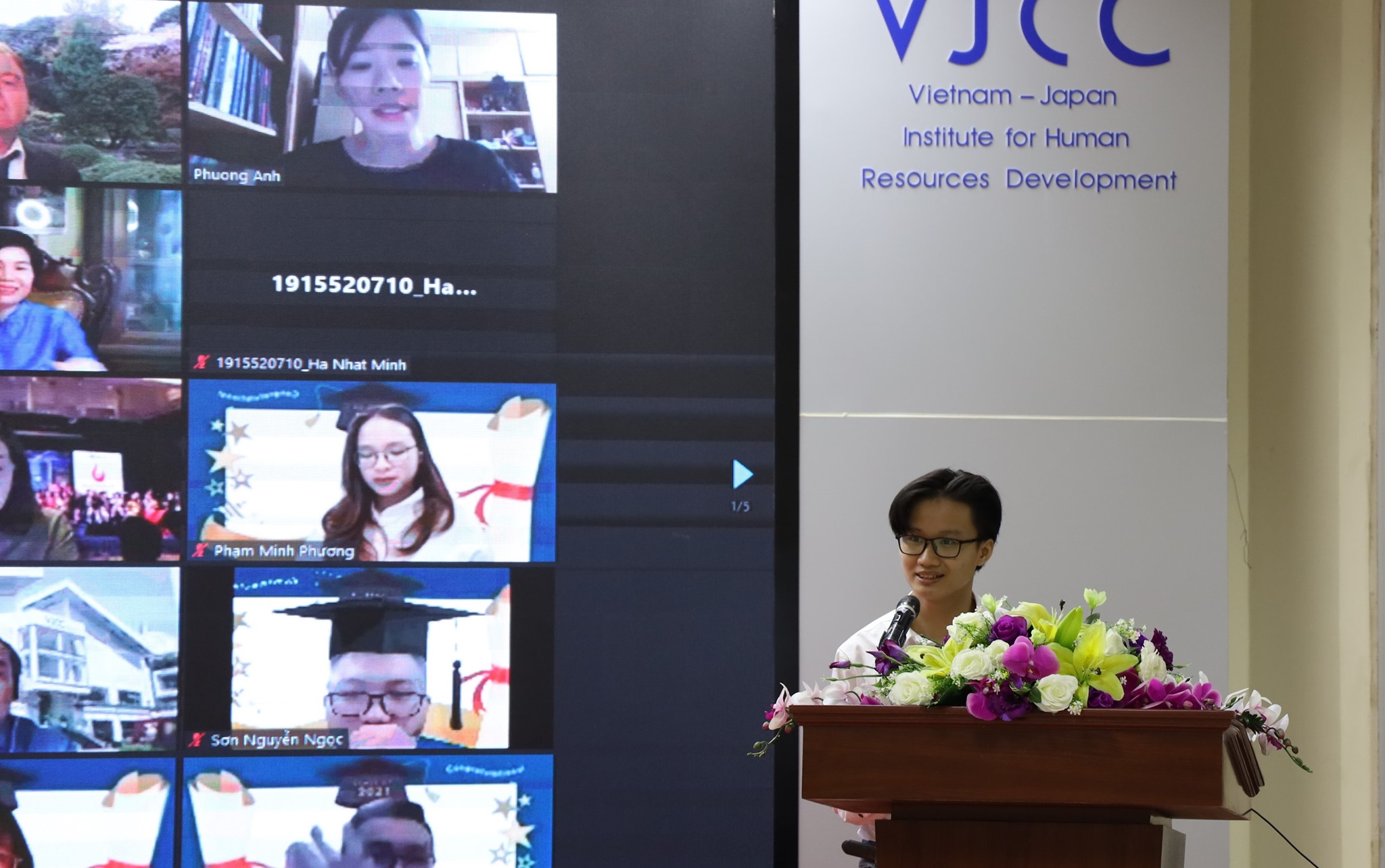 Trong giây phút xúc động, bạn Lê Quốc Trung đã đại diện cho 59 tân Cử nhân tốt nghiệp đã gửi lời cảm ơn sâu sắc nhất đến Ban Giám hiệu Nhà trường, Ban lãnh đạo Viện VJCC, các các bộ, giảng viên, nhân viên Viện VJCC và các bậc phụ huynh đã không quản khó khăn, vất vả, hỗ trợ hết mình để các em có được thành quả như hôm nay. Những kiến thức và kỹ năng mà các thầy cô đã truyền đạt sẽ là hành trang quý giá giúp các em tự tin và bản lĩnh, sẵn sàng đương đầu mọi thử thách, tiếp nối truyền thống tốt đẹp của nhà trường, trở thành nguồn nhân lực chất lượng cao, những công dân có ích cho xã hội để luôn tự hào là những “Người Ngoại thương”.