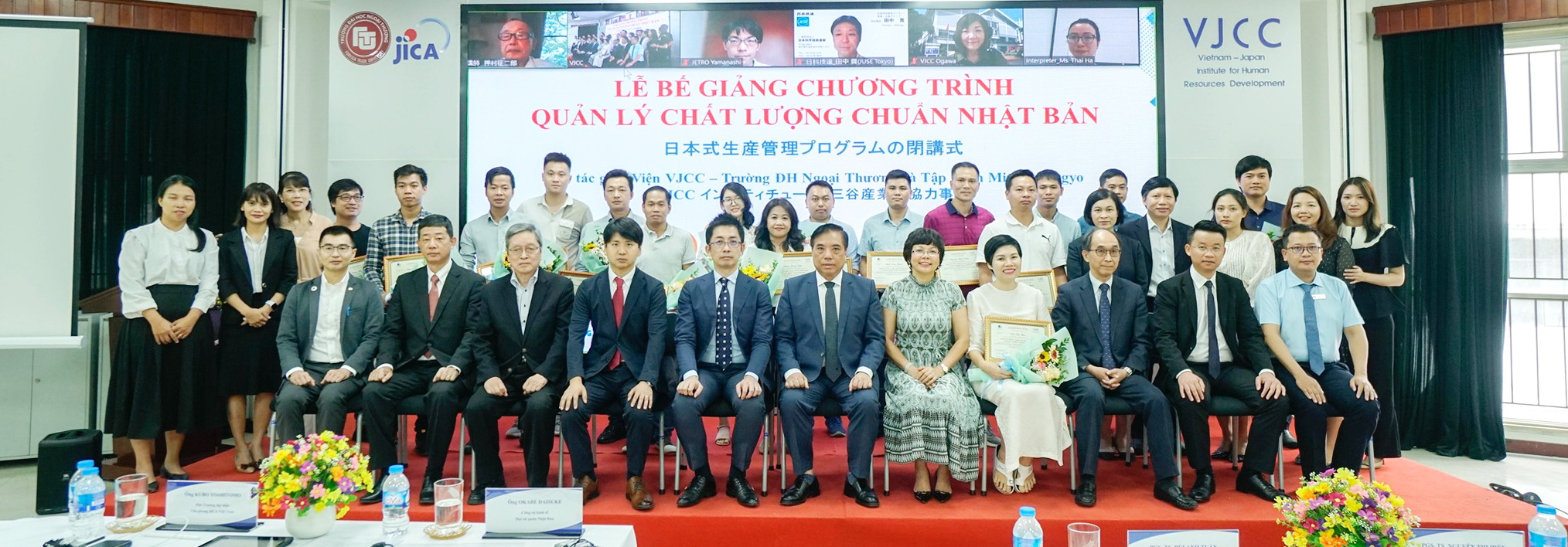 Ngày 22/07/2022, Viện Phát triển nguồn nhân lực Việt Nam – Nhật Bản (VJCC) đã tổ chức Lễ bế giảng Khóa đào tạo “Quản lý chất lượng chuẩn Nhật Bản” – Chương trình hợp tác giữa Viện VJCC - Trường ĐH Ngoại thương và Tập đoàn Mitani Sangyo.