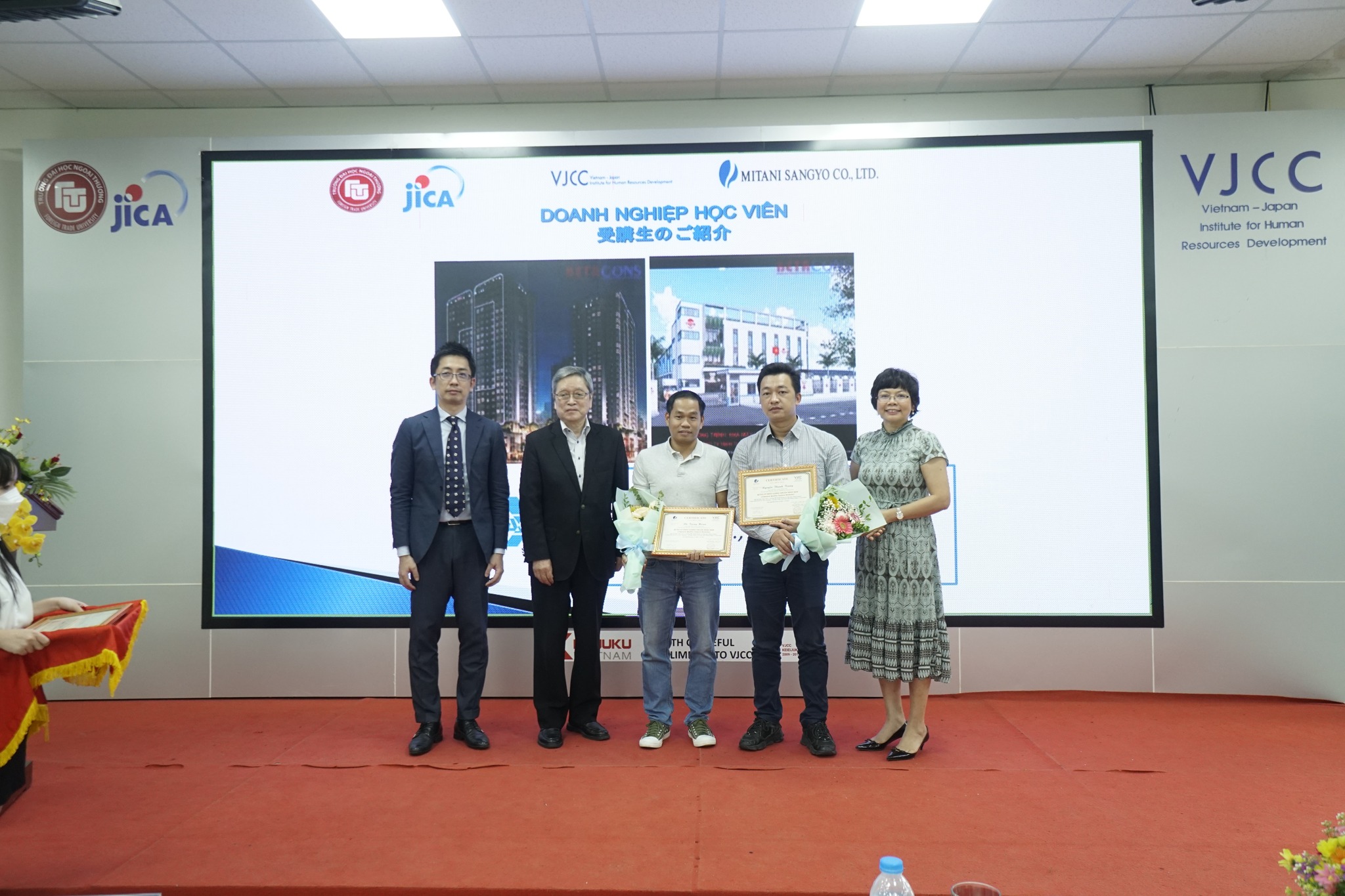 Đại diện Tập đoàn Mitani và Viện VJCC, trường ĐH Ngoại thương đã trao hoa và chứng chỉ cho các học viên hoàn thành khóa đào tạo.