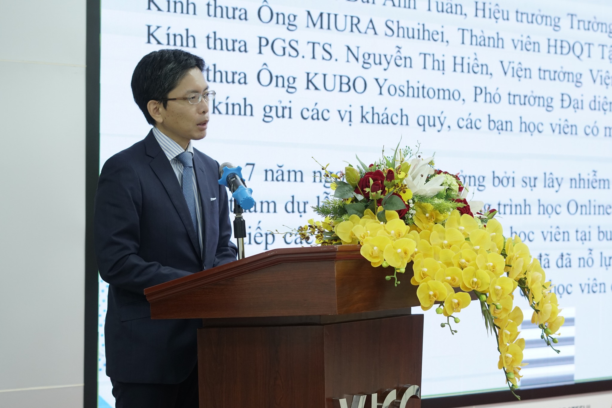 Phát biểu tại buổi lễ, PGS, TS Bùi Anh Tuấn gửi lời chúc mừng tới 19 học viên đã hoàn thành xuất sắc khóa đào tạo. Trong suốt 1 năm học, 19 học viên của khóa học đã hết sức nỗ lực tham gia học tập trong bối cảnh diễn biến dịch Covid-19 với nhiều khó khăn. Thầy khẳng định các học viên của chương trình là những tấm gương sáng cho tinh thần học hỏi, quyết tâm vượt khó để tìm đến tri thức mới, cách làm mới áp dụng cho doanh nghiệp. Thầy tin tưởng các học viên và doanh nghiệp đã thu hoạch được kết quả cải tiến rõ ràng trong thời gian vừa học, vừa nghe tư vấn chuyên gia và vừa áp dụng kiến thức đã được học vào thực tiễn doanh nghiệp của mình quản lý. Cuối cùng, thầy đã gửi lời cảm ơn tới các chuyên gia, giảng viên, cán bộ điều phối của Tập đoàn Mitani Sangyo và Viện VJCC vì những nỗ lực để tổ chức thành công khóa đào tạo.