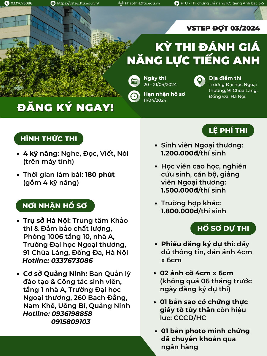 Mọi thông tin chi tiết về kỳ thi và hồ sơ dự thi vui lòng xem tại: https://vstep.ftu.edu.vn/category/ky-thi-vstep/thong-bao-thi-vstep/