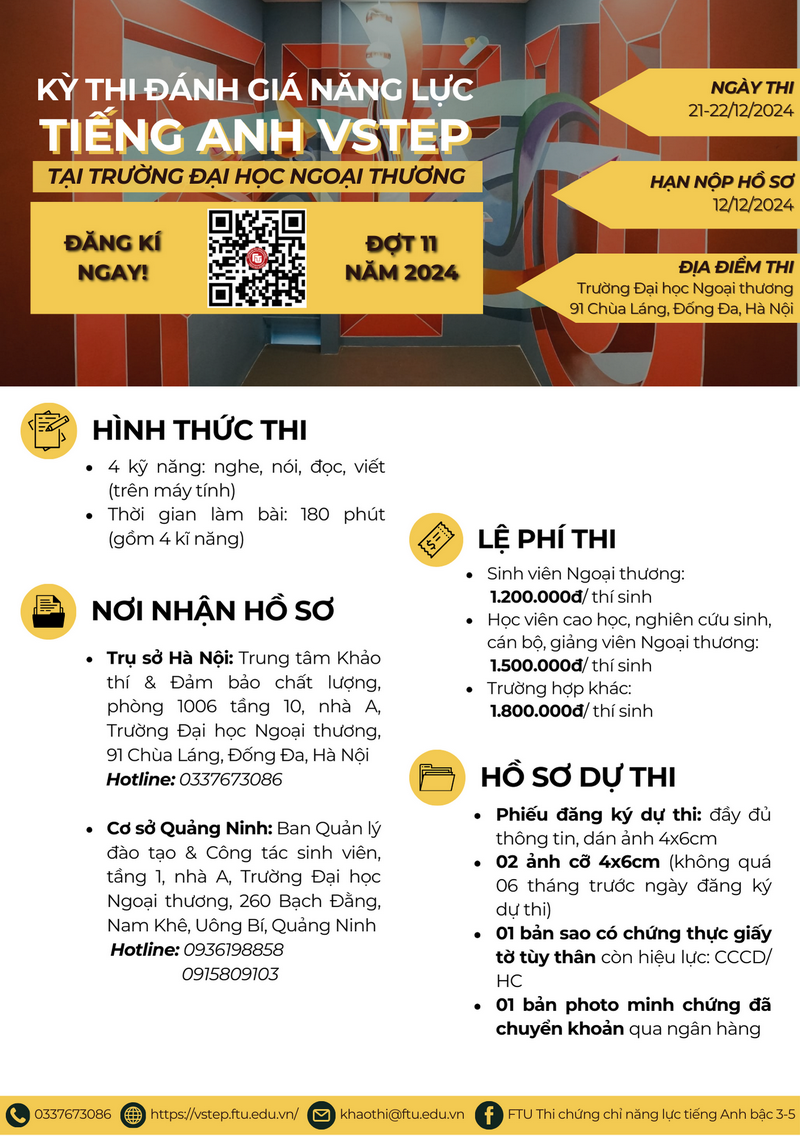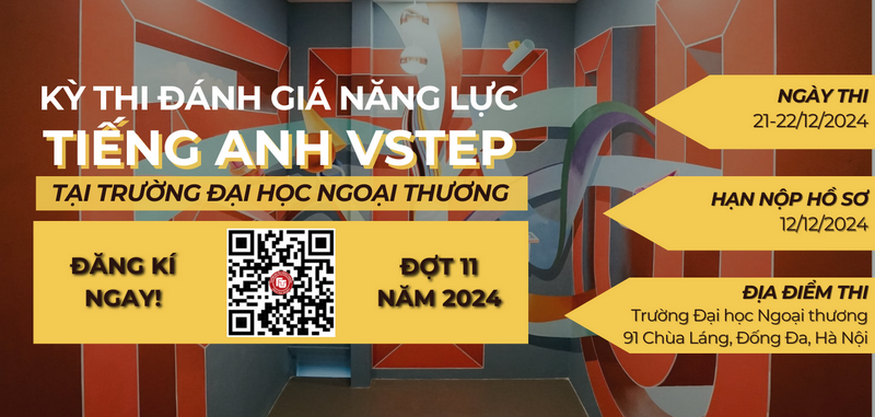 Trường Đại học Ngoại thương thông báo về việc tổ chức thi và cấp chứng chỉ năng lực tiếng Anh theo Khung năng lực ngoại ngữ 6 bậc dùng cho Việt Nam, kỳ thi ngày 21-22/12/2024, cụ thể như sau: