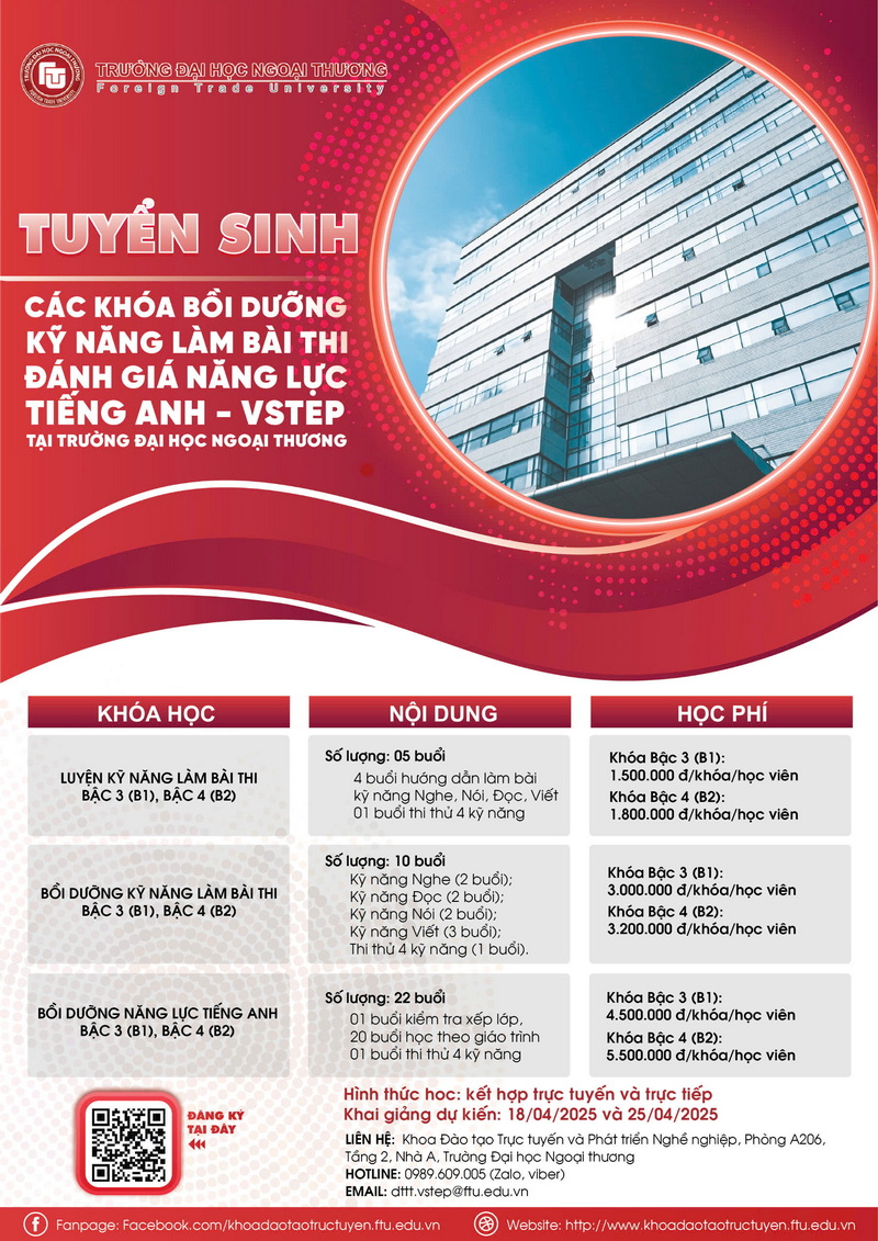 Trường Đại học Ngoại thương tổ chức các khóa bồi dưỡng kỹ năng làm bài thi đánh giá năng lực tiếng Anh theo khung năng lực Ngoại ngữ 6 (NLNN 6) bậc dùng cho Việt Nam tháng 04/2025, cụ thể như sau: