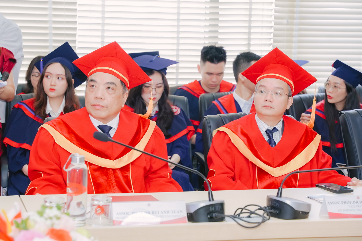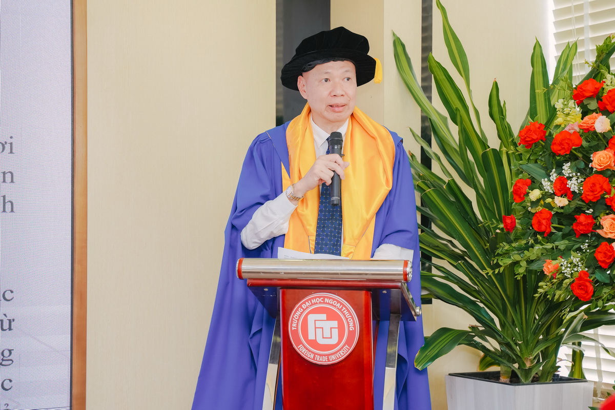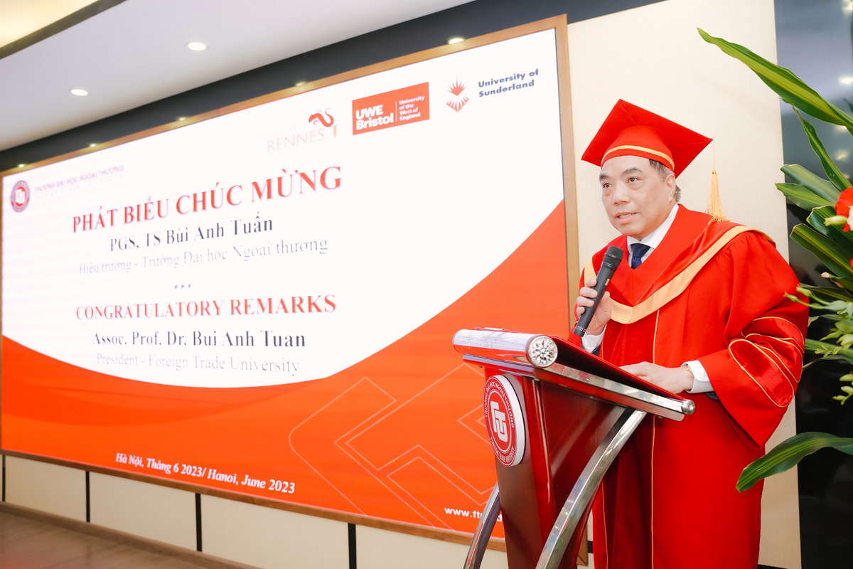 Phát biểu tại buổi lễ, PGS, TS Bùi Anh Tuấn cho biết, tất cả các tân thạc sĩ tốt nghiệp ngày hôm nay đều đã không ngừng nỗ lực miệt mài, FTU rất tự hào về các bạn cũng như những thành tựu mà các học viên đã đạt được. Với tấm bằng Thạc sĩ vừa được trao, PGS, TS Bùi Anh Tuấn tin tưởng rằng các tân thạc sĩ đã tạo nên được sự khác biệt lớn cho bản thân. Giá trị mà bằng cấp của Chương trình Thạc sĩ liên kết đào tạo của Trường ĐH Ngoại thương mang lại là khả năng đáp ứng các tiêu chí mà các cơ quan chính phủ cũng như các lãnh đạo doanh nghiệp tại Việt Nam đang tìm kiếm, bao gồm: khả năng tiếng Anh thành thạo, chất lượng quốc tế đã được công nhận cùng một tư duy toàn cầu. Thành công ngày hôm nay của các học viên có sự góp phần không nhỏ từ gia đình, người thân, các thầy cô giáo cũng như sự nhiệt tình hỗ trợ của các đối tác nước ngoài.