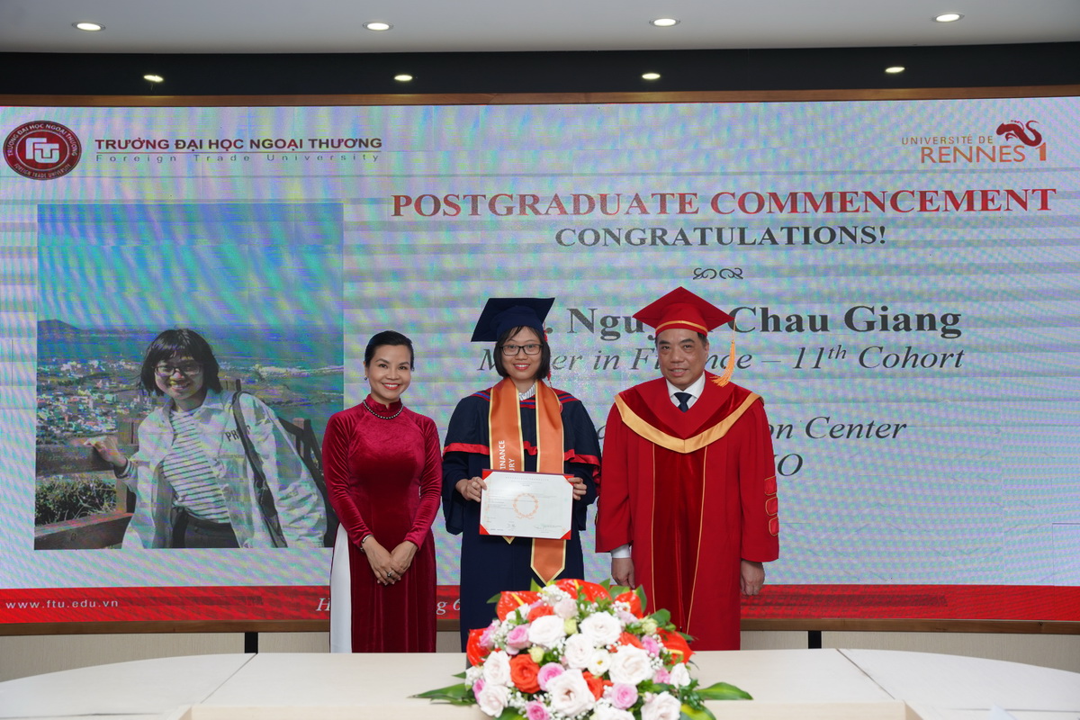 Ngày 10/06/2023, Trường ĐH Ngoại thương đã trang trọng tổ chức Lễ Tốt nghiệp cho 49 học viên của các chương trình thạc sĩ, Gồm: Thạc sĩ Luật Kinh tế & Thương mại Quốc tế (Khóa 5) liên kết với ĐH Tây Anh Quốc (Anh Quốc); Thạc sĩ Tài chính (Khóa 11) liên kết với ĐH Rennes 1 (Pháp); Thạc sĩ Quản trị Kinh doanh (Khóa 4) liên kết với ĐH Sunderland (Anh Quốc).