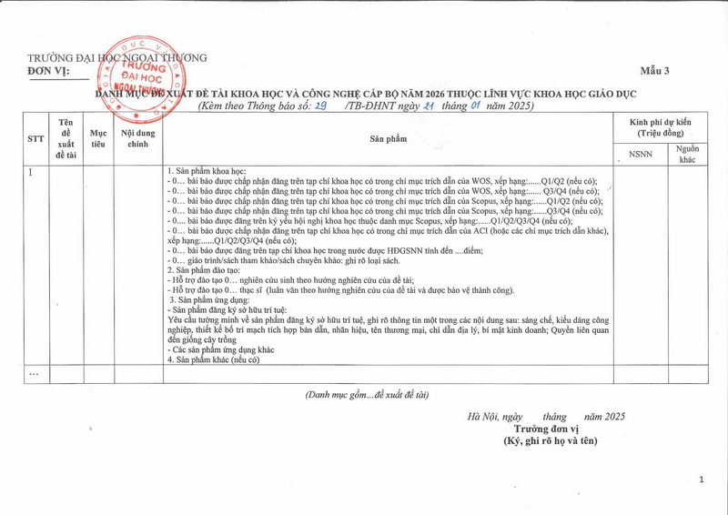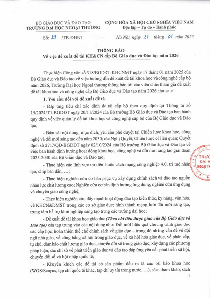 Thông báo về việc đề xuất đề tài KH&CN cấp Bộ Giáo dục và Đào tạo năm 2026 của trường ĐH Ngoại thương THÔNG BÁO Previous Article Thông báo tuyển dụng giảng viên năm 2025 giảng dạy tại khoa Tiếng Trung Quốc, khoa Đào tạo Quốc tế và khoa Tiếng Pháp Trường Đại học Ngoại thương Next Article CHÍNH THỨC PHÁT ĐỘNG CUỘC THI ẢNH “UNBOX YOUR TẾT” NĂM 2025 Trường ĐH Ngoại thương thông báo về việc đề xuất đề tài KH&CN cấp Bộ Giáo dục và Đào tạo năm 2026. Các văn bản biểu mẫu xem tại đây >>> Previous Article Thông báo tuyển dụng giảng viên năm 2025 giảng dạy tại khoa Tiếng Trung Quốc, khoa Đào tạo Quốc tế và khoa Tiếng Pháp Trường Đại học Ngoại thương Next Article CHÍNH THỨC PHÁT ĐỘNG CUỘC THI ẢNH “UNBOX YOUR TẾT” NĂM 2025