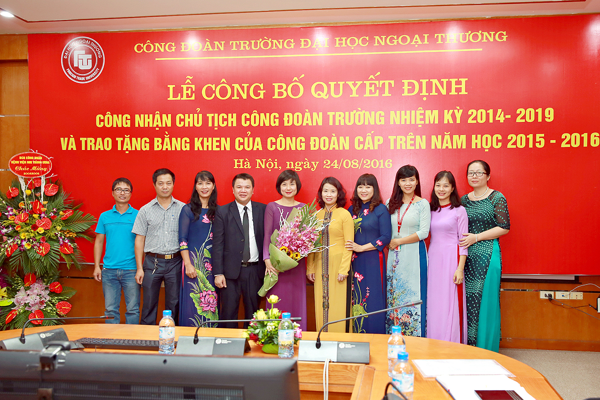 Hôm nay, ngày 24/8/2016 trường Đại học Ngoại thương long trọng tổ chức “Lễ công bố Quyết định công nhận Chủ tịch Công đoàn trường nhiệm kỳ 2014 – 2019 và trao tặng Bằng khen của Công đoàn cấp trên năm học 2015 – 2016”.
