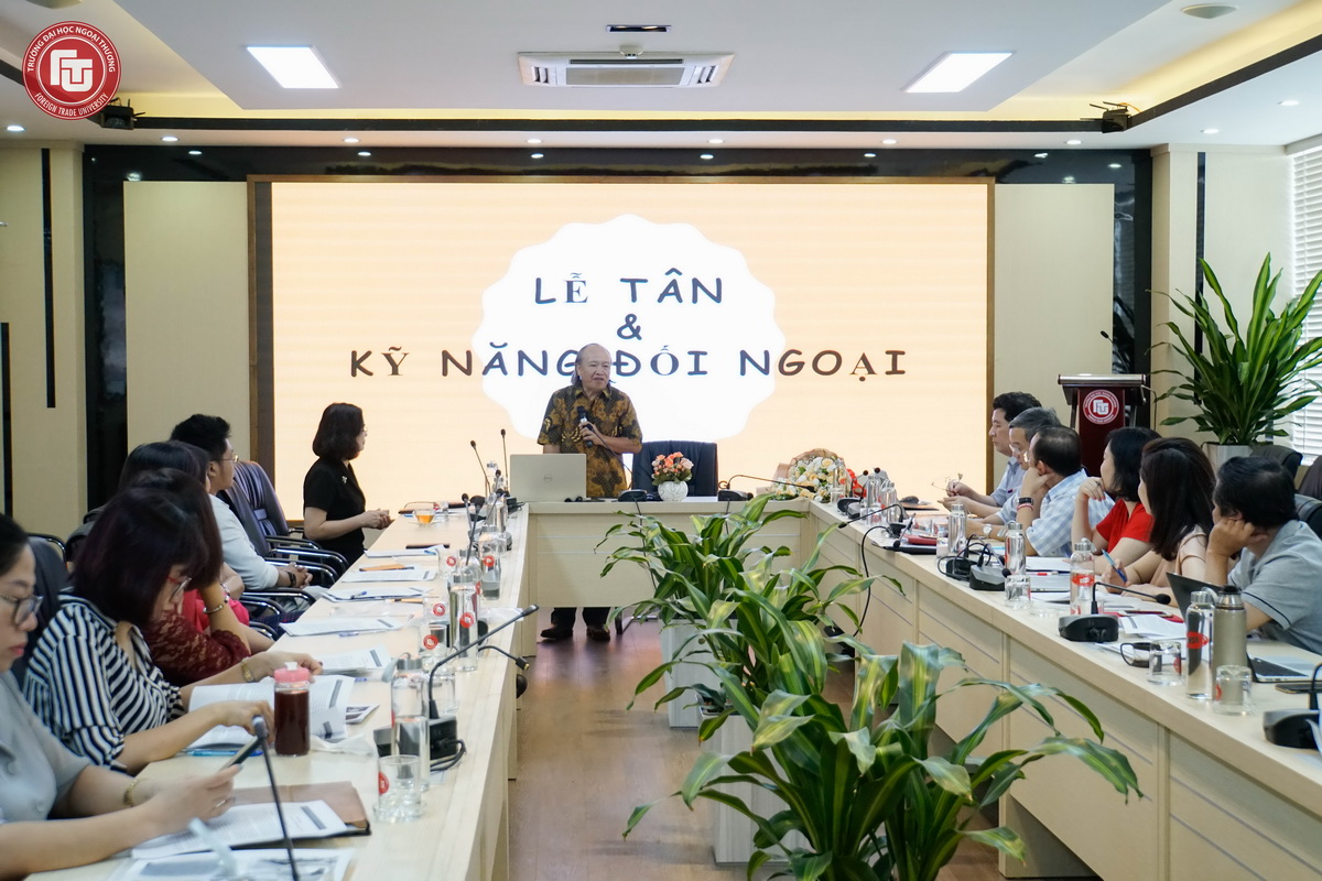 Tại khóa đào tạo, các học viên đã được giới thiệu các kỹ năng giao tiếp hiệu quả, các nguyên tắc xây dựng và duy trì các mối quan hệ chuyên nghiệp, cũng như cung cấp hướng dẫn thực tế cho các tình huống tại môi trường làm việc điển hình. PGS, TS Dương Văn Quảng - Nguyên Giám đốc Học viện Ngoại giao, Nguyên Đại sứ Việt Nam tại Singapore và UNESCO đã giới thiệu về quy trình đón khách quốc tế, quy trình tổ chức lễ ký kết, kỹ năng làm chủ nhà, kỹ năng làm khách mời. Ông Trương Quang Thành - CEO Nhà hàng Maison Vie với 25 năm kinh nghiệm về ẩm thực và văn hóa Pháp và ông Alex Thịnh - Giám đốc Đào tạo rượu - CGC Thịnh Phát, Giám khảo rượu vang quốc tế HK IWSC 2017, giám khảo cuộc thi chung kết Sommelier Việt Nam 2018 và chủ nhân nhiều giải thưởng cao quý liên quan đã giới thiệu và hướng dẫn về Văn hóa tại tiệc chiêu đãi: Vai trò của chủ tiệc (lựa chọn kiểu tiệc, lựa chọn thực đơn và đồ uống, bố trí vị trí quan khách, trình tự nhập tiệc, giao tiếp trong tiệc chiêu đãi với vai trò chủ tiệc); Vai trò của khách mời (những điều cần biết khi được mời dự tiệc chiêu đãi, giao tiếp trong tiệc chiêu đãi với vai trò khách mời); Sử dụng dụng cụ ăn uống trên bàn tiệc; Những phép tắc, điều cần làm và tránh trong ăn uống; Những kiến thức căn bản về rượu vang - những chi tiết nhỏ nhưng chắc chắn góp phần tạo nên ấn tượng lớn về tầm hiểu biết và sự tôn trọng dành cho những quan khách đến từ các nền văn hóa khác. Tại khóa học, các học viên cũng đã được trực tiếp tham gia thực hành tại tiệc chiêu đãi theo phong cách Pháp.