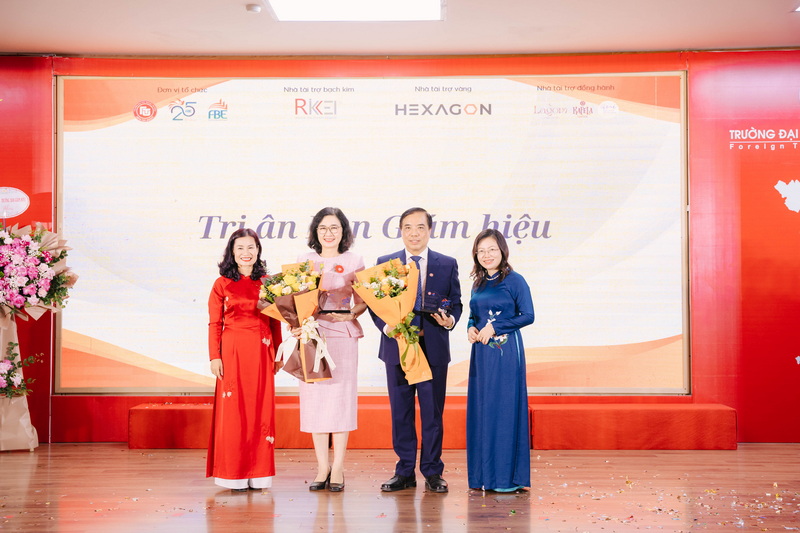 Trong không khí trang trọng và ấm áp, Ban tổ chức cũng đã trao tặng những bó hoa tươi thắm, thể hiện lòng biết ơn tới các thế hệ lãnh đạo, giảng viên và đối tác của chuyên ngành. Tiếp nối không khí tri ân, nghi thức cắt bánh và nâng ly chúc mừng đã diễn ra, đánh dấu 25 năm trưởng thành và phát triển của chuyên ngành Tiếng Anh Thương mại. Đây là khoảnh khắc đặc biệt, gắn kết các thế hệ và mở ra hy vọng cho chặng đường mới đầy khởi sắc.