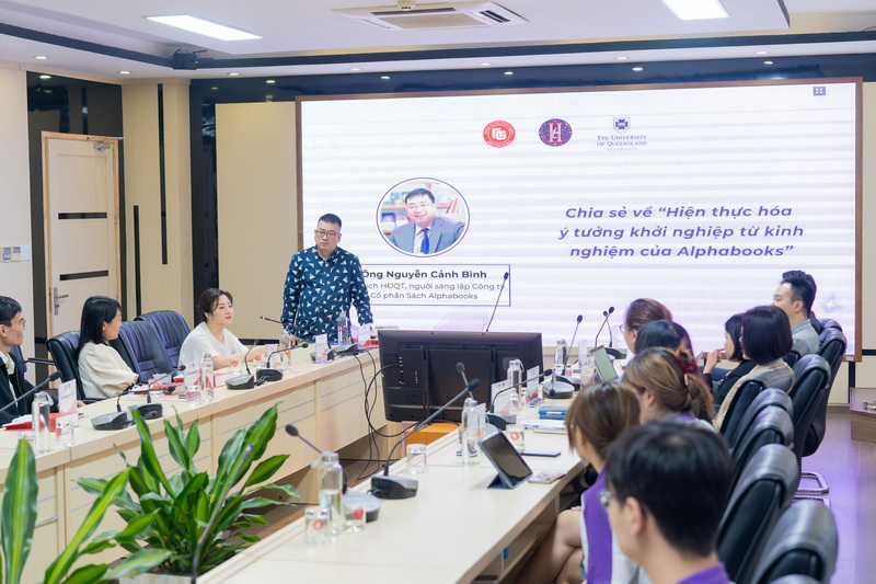 Phần chia sẻ đầy nhiệt huyết của ông Nguyễn Cảnh Bình, chủ tịch HĐQT và người sáng lập Alphabooks đã mở ra những góc nhìn thú vị và khơi dậy tinh thần dám nghĩ, dám làm trong lòng các sinh viên. Những câu chuyện về hành trình khởi nghiệp, tìm kiếm và kết nối các cộng sự tài năng, các nguồn lực, những thách thức gặp phải trong khởi nghiệp thật lắng đọng và hấp dẫn. Ông Bình cũng trao gửi tủ sách Read Station để các bạn sinh viên i-Hons có cơ hội được tiếp cận thêm với những kiến thức hay của nhân loại. Phần thảo luận giữa đại diện các đơn vị trong Trường và đại diện Alphabooks đã diễn ra sôi nổi, gợi mở các hướng hợp tác, hỗ trợ học tập, đào tạo, hợp tác quốc tế giữa hai bên.