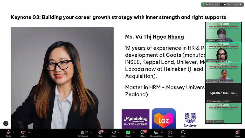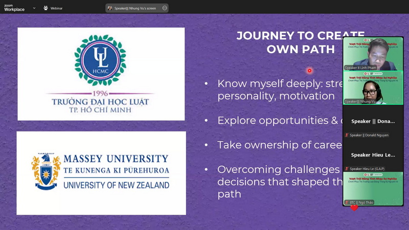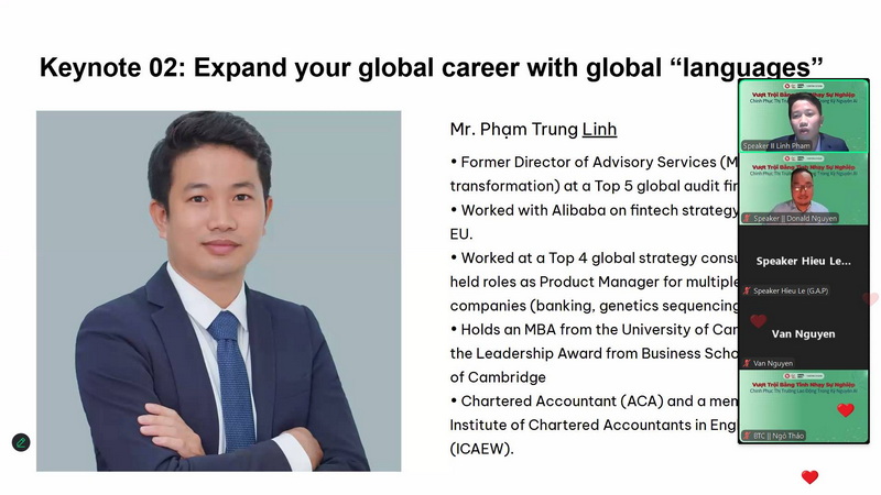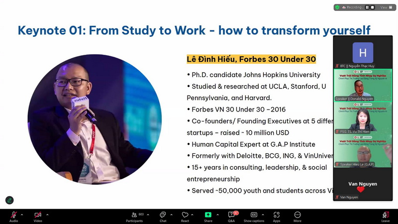 Tọa đàm có sự tham gia chia sẻ của các diễn giả uy tín là những chuyên gia hàng đầu trong lĩnh vực giáo dục, công nghệ và nhân sự: Chị Nhung Vũ – Giám đốc Tuyển dụng Nhân tài, Heineken Việt Nam Heineken Việt Nam; Anh Hiếu Lê - Nhà giáo dục & khởi nghiệp; Anh Linh Phạm – Nguyên Giám đốc BDO Vietnam; Anh Dũng Nguyễn - Giảng viên doanh nghiệp, đồng sáng lập AIM Academy, WeCreate, HappyLife. Các diễn giả đã mang đến một chương trình đậm tính thực tiễn, đi sâu vào các chủ đề đang được sinh viên quan tâm như: Chuyển mình từ giảng đường ra thị trường: hiểu đúng – chuẩn bị đúng – bắt đầu đúng; Kinh nghiệm quốc tế và các ngôn ngữ kinh doanh toàn cầu: kỹ năng nào để không bị “đào thải” bởi máy học?; AI trong ngành nhân sự và làn sóng layoff 2022–2025: sinh viên cần làm gì để không “rơi khỏi bàn cờ”?; Chiến lược phát triển bản thân và thương hiệu cá nhân: không chỉ giỏi, mà còn phải “có dấu ấn”.