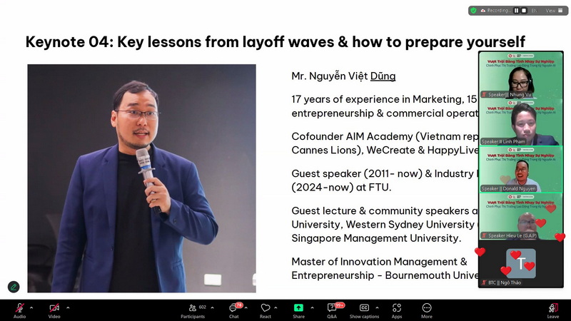 Diễn ra trên nền tảng trực tuyến, Tọa đàm đã thu hút sự tham dự của 622 sinh viên đến từ các chuyên ngành đào tạo khác nhau của Trường ĐH Ngoại thương. Chương trình được tổ chức với mục tiêu trang bị cho sinh viên những tư duy và kỹ năng thiết yếu để thích ứng và phát triển trong bối cảnh thị trường lao động không ngừng biến đổi bởi tác động của công nghệ, đặc biệt là trí tuệ nhân tạo.