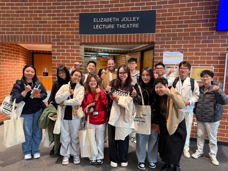 Ngay từ những ngày đầu tiên, các em đã được chào đón bởi GS Panos Piperopoulos – Trưởng phòng Hợp tác quốc tế của Khoa Kinh doanh và Luật, ĐH Curtin, cùng đội ngũ nhà trường tận tình hỗ trợ. Buổi gặp gỡ đầu tiên tại giảng đường Elizabeth Jolley Lecture Theatre thực sự là một khởi đầu ấm áp và đáng nhớ.