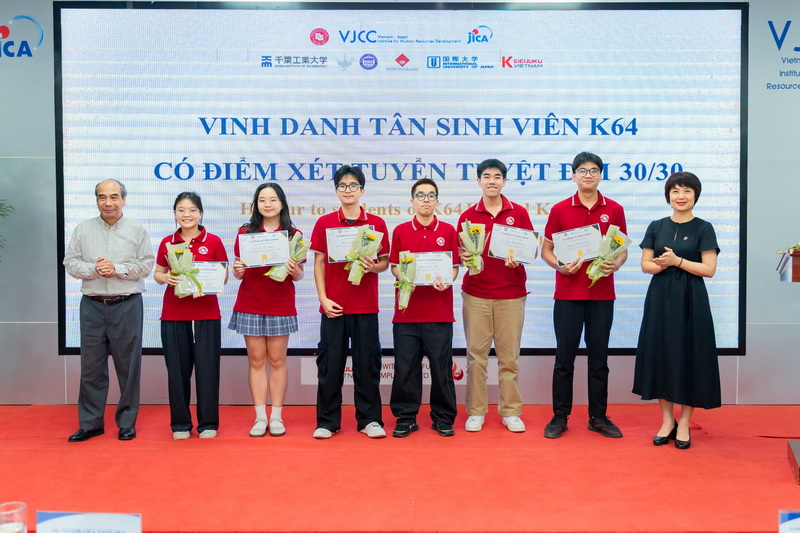 PGS, TS Phạm Thu Hương – Hiệu trưởng Nhà trường và GS, TSKH Hồ Tú Bảo – Giám đốc Phòng thí nghiệm Khoa học dữ liệu của Viện Nghiên cứu Cao cấp về Toán trao tặng hoa và giấy khen tới các tân sinh viên K64 có điểm xét tuyển tuyệt đối 30/30 của Chương trình Cử nhân Kinh doanh Quốc tế theo mô hình tiên tiến Nhật Bản (JIB) và Kinh doanh số (DB) năm 2025 PGS, TS Nguyễn Thị Hiền – Viện trưởng Viện VJCC và ThS Trần Thị Kiều Minh - Phó Viện trưởng Viện VJCC trao tặng giấy khen và hoa chúc mừng tới các sinh viên tiêu biểu năm học 2024 - 2025.