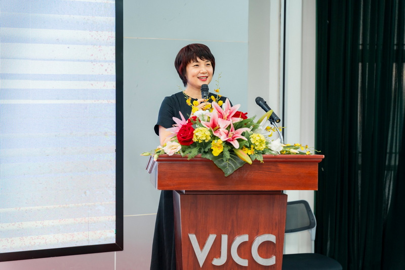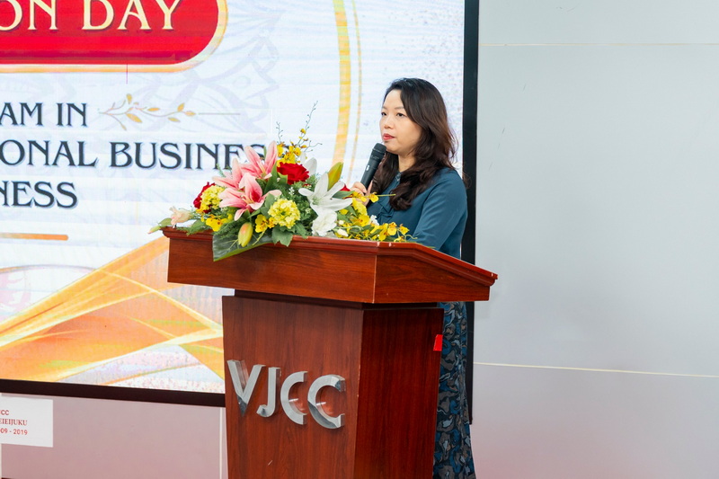 Cô cũng không quên bày tỏ sự tri ân đặc biệt đối với sự ủng hộ tài trợ từ các đơn vị, tổ chức và doanh nghiệp dành cho các sinh viên Viện VJCC: Công ty Đồ gỗ mỹ nghệ Hướng Mai với học bổng trị giá 60 triệu đồng; Công ty Cổ phần Hanel và Hiệp hội nữ Doanh nhân thành phố Hà Nội với học bổng trị giá 50 triệu đồng và Công ty TNHH HC Hoa Lư với học bổng trị giá 50 triệu đồng Nối tiếp lời chào từ các tổ chức quốc tế là phần phát biểu của 2 đại diện doanh nghiệp tới từ cộng đồng Keieijuku – những doanh nghiệp luôn đồng hành và cung cấp sự hỗ trợ quý báu cho tập thể sinh viên Viện VJCC.