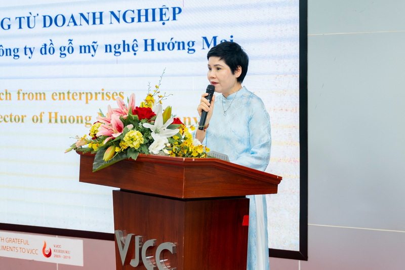 Bà Vũ Thị Mai - Giám đốc Công ty Đồ gỗ mỹ nghệ Hướng Mai đã gửi lời chúc mừng và động viên tới toàn thể sinh viên đồng thời cam kết sẽ luôn là đơn vị đồng hành và hỗ trợ cho các sinh viên tiêu biểu, sinh viên vượt khó của Viện VJCC.