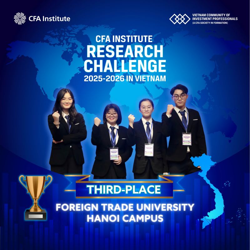 Ngày 20/12/2025, 02 đội thi của Trường ĐH Ngoại Thương (01 đội của Trụ sở chính Hà Nội và 01 đội đến từ Cơ sở II tại TP. Hồ Chí Minh) đã tham dự vòng chung kết toàn quốc Cuộc thi CFA Institute Research Challenge tại Việt Nam 2025 - 2026 tại TP. Hồ Chí Minh.