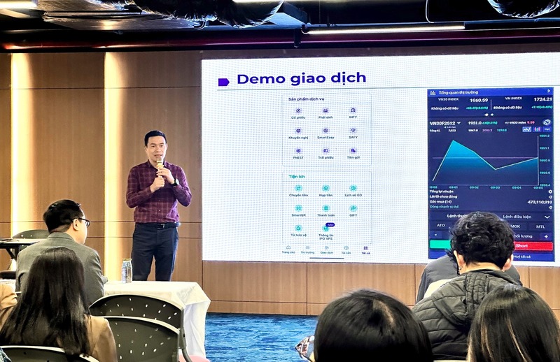 Tiếp đó, ngày 4/12/2025, đoàn học viên có chuyến tham quan Công ty Cổ phần Chứng khoán VPS, nơi ông Uông Văn Quang - Chuyên viên cao cấp tư vấn phái sinh, trực tiếp hướng dẫn giao dịch hợp đồng tương lai VN30 trên tài khoản demo, giúp học viên kết nối kiến thức lý thuyết với diễn biến thị trường trong thời gian thực. Chuỗi trải nghiệm khép lại vào ngày 8/12/2025 với chuyến tham quan Sở Giao dịch Hàng hóa Việt Nam (MXV), nơi bà Đoàn Thị Giang - Chuyên viên Khối Quản lý Giao dịch, hướng dẫn học viên giao dịch hợp đồng phái sinh hàng hóa trên nền tảng CQG – một công cụ chuyên nghiệp đang được sử dụng rộng rãi trên thị trường.
