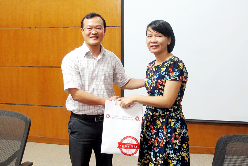 Ông Lê Thái Phong, Phó trưởng khoa QTKD trao quà lưu niệm cho bà Bà Võ Thị Thúy Anh, Phó Hiệu trưởng trường ĐH Kinh tế Đà Nẵng
