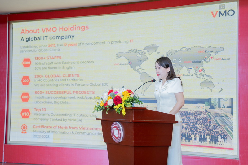 Đại diện đối tác của Viện Kinh tế và Kinh doanh Quốc tế, bà Đặng Hồng Ngọc - Trưởng phòng Đối ngoại và Hợp tác quốc tế Công ty Cổ phần Công nghệ VMO Holdings đã có những chia sẻ về thông tin cũng như các thành tựu mà VMO Holdings đã đạt được cùng với các hoạt động hợp tác của doanh nghiệp với Viện Kinh tế và Kinh doanh Quốc tế. Các hoạt động hợp tác mà hai bên đang triển khai nhằm mục đích nuôi dưỡng những lãnh đạo toàn cầu trong lĩnh vực Marketing và Phát triển Kinh doanh thông qua sự bồi dưỡng về 5 nội dung: kiến thức nền tảng và thực tế phục vụ công việc, sự thích nghi, tinh thần sáng tạo cao, mối quan hệ và tập trung vào định hướng nghề nghiệp. Kết lại bài phát biểu, bà Đặng Hồng Ngọc đã nhấn mạnh câu nói “Don’t Learn for Scores. Learn for Recognition. Don’t work for Money. Work for Opportunities.”. Đây là một bài học quý giá và vô cùng hữu ích cho các bạn tân sinh viên trong suốt chặng đường học tập sắp tới tại trường ĐH Ngoại Thương.