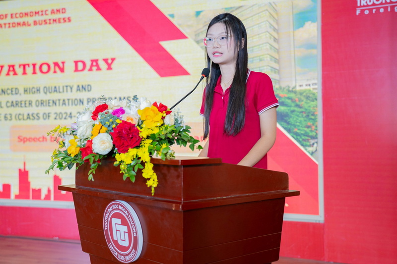Thay mặt cho các bạn tân sinh viên K63, sinh viên Nguyễn Khánh Ngọc đã gửi lời cảm ơn chân thành đến Nhà trường, các thầy cô Viện KT&KDQT, các anh chị khóa trên và bày tỏ quyết tâm cố gắng học tập, rèn luyện thật tốt trong năm học đầu tiên tại Trường ĐH Ngoại thương.