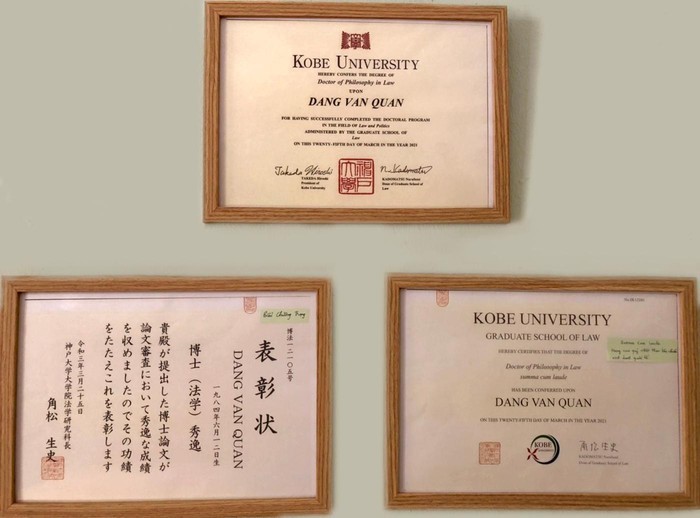 TS. Đặng Văn Quân trở về nước sau khi tốt nghiệp tiến sĩ hạng Summa Cum Laude - “xuất sắc tột đỉnh” với “sự khen ngợi cao nhất” - mức cao nhất của danh dự và khen ngợi theo tiêu chuẩn quốc tế chỉ trao cho trường hợp đạt thành tích cực kỳ nổi bật, ngoại hạng (tốt nghiệp sớm 1 năm nhưng vẫn đạt hạng xuất sắc và đứng đầu toàn khóa) và nhận “Biểu Chương Trạng” cho luận án tiến sĩ xuất sắc, đứng đầu khóa tiến sĩ do hội đồng giáo sư phong tặng, được vinh danh tại Trường Luật Sau Đại học - Đại học Kobe (Nhật Bản) hồi tháng 3/2021.