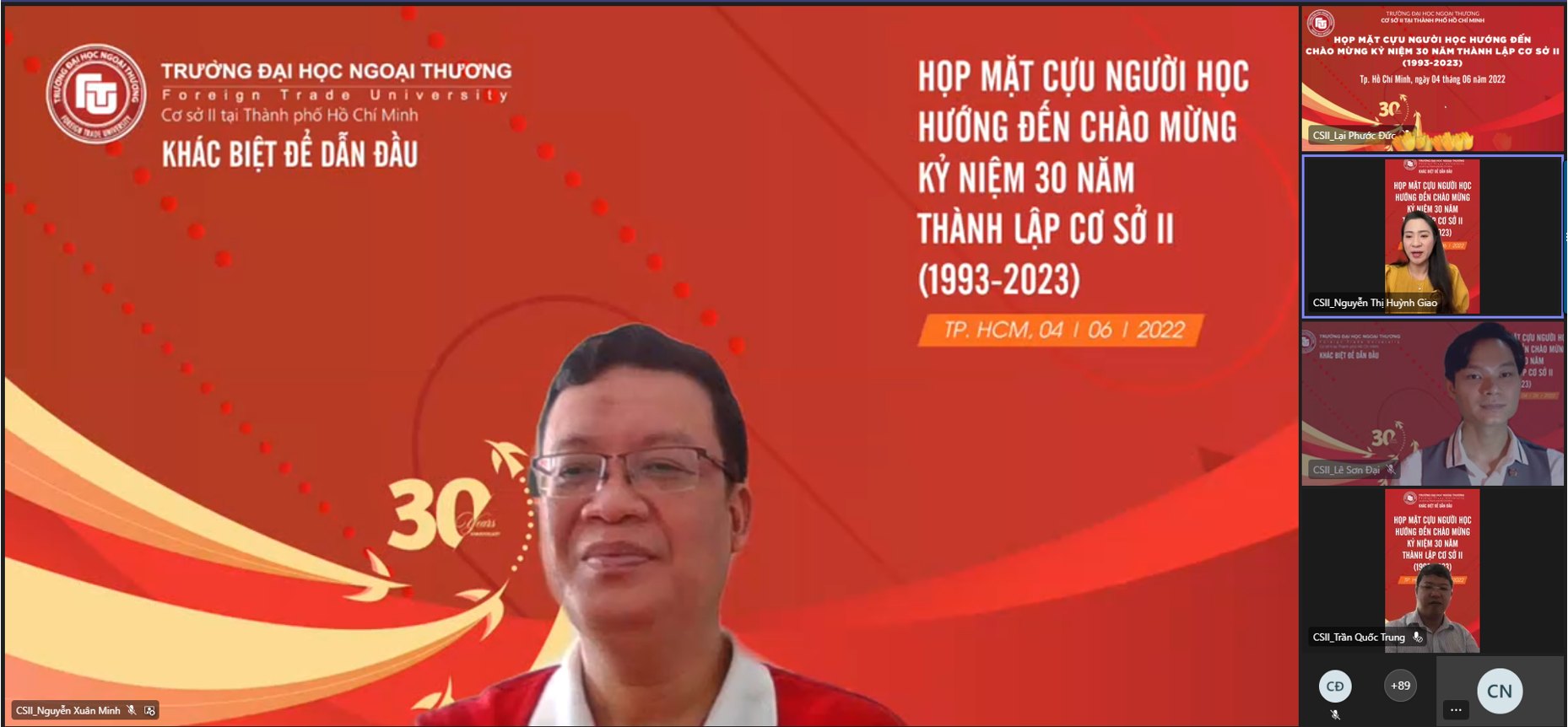 Trong bầu không khí thân tình của buổi họp mặt, đại diện cho cựu sinh viên, học viên Cơ sở II, ông Trần Hữu Đoàn - Phó Chủ tịch thường trực Hội doanh nhân Ngoại thương đã bày tỏ niềm vui khi được có dịp trở lại “đoàn tụ” với anh chị em dưới mái nhà chung trường ĐH Ngoại thương Cơ sở II tại TP. HCM. Đồng thời ông cũng hy vọng trong thời gian tới, các hoạt động gắn kết “Người Ngoại thương” do Hội doanh nhân Ngoại thương và Hội cựu sinh viên Đại học Ngoại Thương phối hợp với Cơ sở II tổ chức sẽ nhận được sự hưởng ứng và tham gia tích cực của các anh chị em cựu sinh viên, học viên các khóa. Bên cạnh đó, ông cũng bày tỏ mong muốn của các thế hệ cựu sinh viên, học viên được đóng góp công sức và đồng hành cùng Cơ sở II không chỉ trong chuỗi các hoạt động kỷ niệm 30 năm thành lập mà còn trong nhiều hoạt động khác.