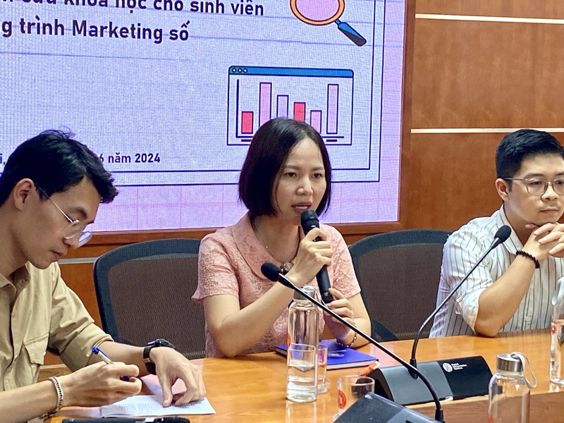 Phát biểu khai mạc tọa đàm, TS Trần Thu Trang – Giảng viên Bộ môn Marketing và Truyền thông, Viện KT&KDQT; Thành viên Ban thực hiện chương trình Marketing số đã nhấn mạnh tầm quan trọng cũng như ý nghĩa của việc nghiên cứu khoa học đối với sinh viên. Cô bày tỏ mong muốn trong những năm tới đây sẽ có nhiều nhóm sinh viên chương trình Marketing số tham gia các cuộc thi sinh viên nghiên cứu khoa học hơn nữa.