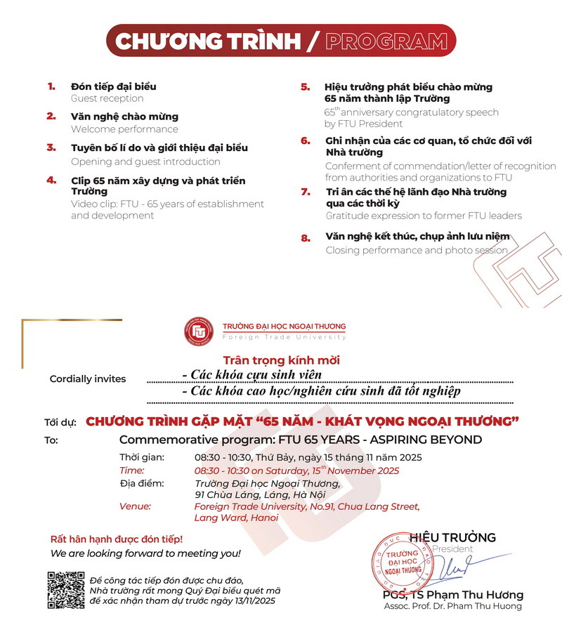 Vui lòng theo dõi các chương trình chào mừng kỷ niệm 65 năm thành lập Trường Đại học Ngoại Thương tại: https://ftu.edu.vn/ky-niem-65-nam