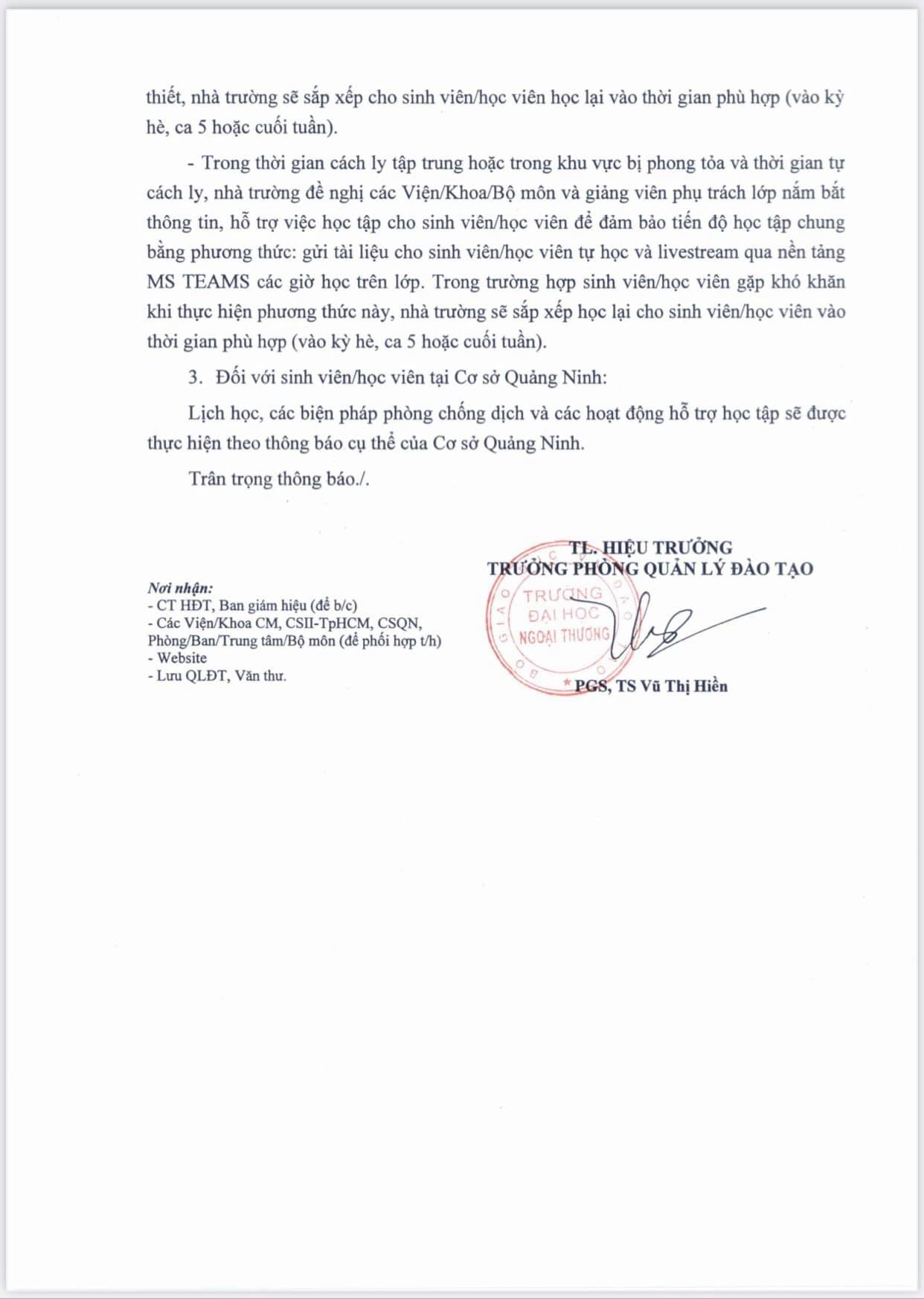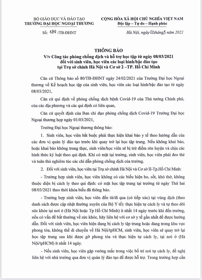 Thông báo về công tác phòng chống dịch và hỗ trợ học tập trung kể từ ngày 8/3 cho sinh viên, học viên các loại hình/bậc đào tạo tại trụ sở chính Hà Nội và cơ sở 2 Tp Hồ Chí Minh.