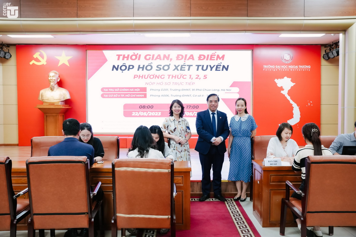 Tại chương trình, PGS, TS Bùi Anh Tuấn - Hiệu trưởng Nhà trường; PGS, TS Phạm Thu Hương - Phó Hiệu trưởng cũng đã dành thời gian đến khu vực nhận hồ sơ xét tuyển để giải đáp các thắc nhắc và hỗ trợ các thí sinh cùng phụ huynh trong việc đăng ký xét tuyển, cũng như thăm hỏi, động viên các thầy cô cùng các bạn sinh viên nhận hồ sơ cũng như tư vấn, trao đổi cùng các bạn thí sinh. PGS, TS Vũ Thị Hiền - Trưởng Phòng Quản lý Đào tạo (QLĐT) và ThS Trần Đắc Lộc - Phó trưởng phòng QLĐT cùng các cán bộ, giảng viên và các bạn sinh viên CLB Diễn đàn sinh viên Trường ĐH Ngoại thương (FTU Forum) luôn sẵn sàng giúp đỡ, tư vấn, giải đáp những thắc mắc, băn khoăn của phụ huynh và các em học sinh cũng như hỗ trợ giải quyết vấn đề trong quá trình xét tuyển.