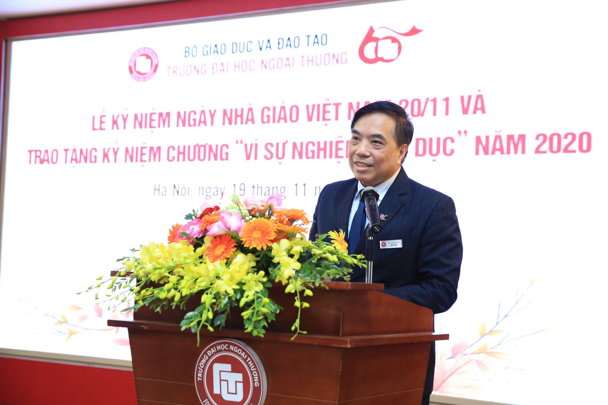 Trước hết, thay mặt tập thể lãnh đạo và tập thể sư phạm Trường ĐH Ngoại thương, tôi nhiệt liệt chào mừng toàn thể các vị đại biểu, khách quý, các thầy cô giáo và toàn thể quý vị đã tới dự Lễ kỷ niệm Ngày Nhà giáo Việt Nam 20/11 và trao tặng kỷ niệm chương "Vì sự nghiệp giáo dục" năm 2020 cho 17 cán bộ, viên chức của nhà trường ngày hôm nay.