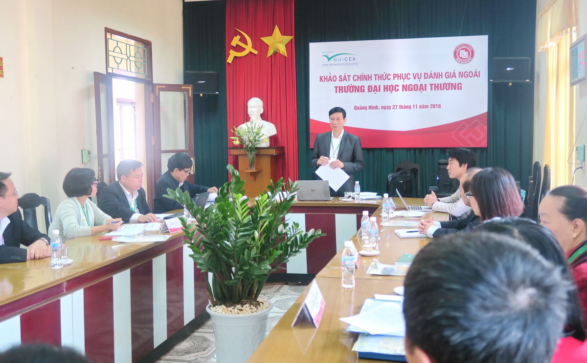 Theo lịch trình làm việc, ngày 27/11/2016, tại Cơ sở Quảng Ninh (Trường Đại học Ngoại thương), Trung tâm Kiểm định chất lượng giáo dục - Đại học Quốc gia Hà Nội (KĐCLGD-ĐHQGHN) đã tiến hành khảo sát chính thức phục vụ đánh giá ngoài Trường Đại học Ngoại thương theo tiêu chuẩn đánh giá chất lượng trường đại học của Bộ Giáo dục và Đào tạo.