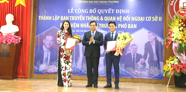 Tại buổi lễ, PGS. TS Bùi Anh Tuấn - Hiệu trưởng đã trao Quyết định thành lập, các quyết định bổ nhiệm và phân công nhân sự của Ban Truyền thông và Quan hệ đối ngoại. Theo đó, bổ nhiệm ThS. Lê Giang Nam - Giảng viên Bộ môn Nghiệp vụ giữ chức vụ Trưởng Ban; ThS. Nguyễn Thị Huỳnh Giao - Giảng viên Bộ môn Cơ sở - Cơ bản giữ chức vụ Phó trưởng Ban.