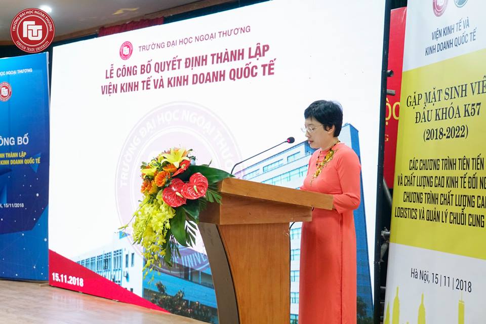 Phát biểu đáp từ, PGS, TS Bùi Thị Lý bày tỏ cảm ơn sâu sắc tới Đảng ủy, BGH Nhà trường đã luôn quan tâm, có những chỉ đạo kịp thời, sát sao hoạt động của Khoa KT&KDQT trước kia, nay là Viện KT&KDQT. Cô cũng bày tỏ xúc động và cảm ơn khi được Đảng ủy, BGH Nhà trường tín nhiệm bổ nhiệm làm Viện trưởng Viện KT&KDQT. Cùng ôn lại quá trình hình thành phát triển Viện KT&KDQT mà tiền thân là Khoa Kinh tế Ngoại thương, Cô bày tỏ niềm tự hào trước bề dày lịch sử của một đơn vị có truyền thống lâu đời nhất trường ĐHNT. Cô khẳng định tập thể cán bộ, giảng viên, sinh viên Viện KT&KDQT sẽ nghiêm túc tiếp thu những ý kiến chỉ đạo trong bài phát biểu của Thầy Hiệu trưởng, khẳng định quyết tâm sẽ đưa Viện KT&KDQT phát triển vững vàng, thực hiện thành công đề án thí điểm đổi mới tổ chức và quản lý của Nhà trường.