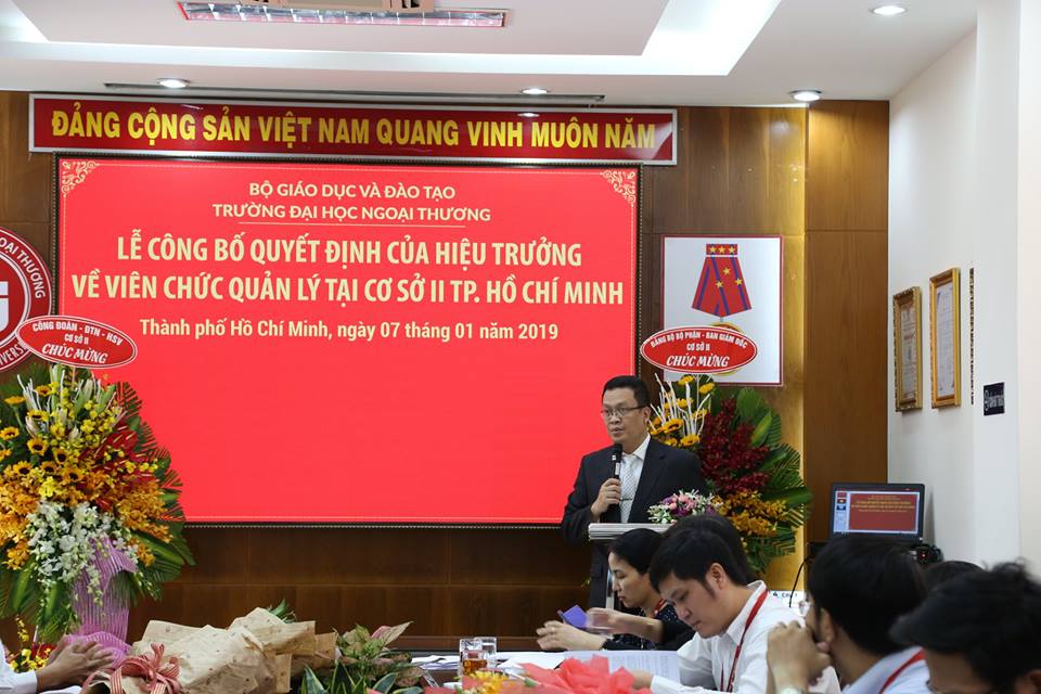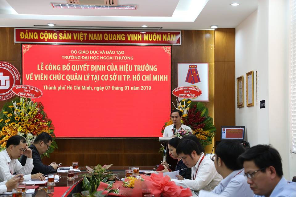 Ngày 07/01/2019, thừa ủy quyền của Hiệu trưởng, Cơ sở II tại TP. HCM đã long trọng tổ chức Lễ công bố Quyết định bổ nhiệm viên chức quản lý đối với vị trí Phó Trưởng Ban Đào tạo Quốc tế và Phó Trưởng Bộ môn Tiếng Anh.