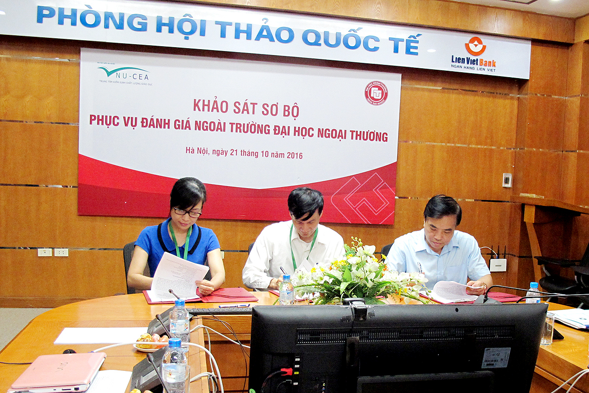 Ngày 21/10/2016, Trường Đại học Ngoại thương đón tiếp đoàn chuyên gia đánh giá ngoài của Trung tâm Kiểm định chất lượng giáo dục – Đại học Quốc gia Hà Nội về khảo sát sơ bộ tại Trụ sở Hà Nội để chuẩn bị cho đợt khảo sát chính thức.