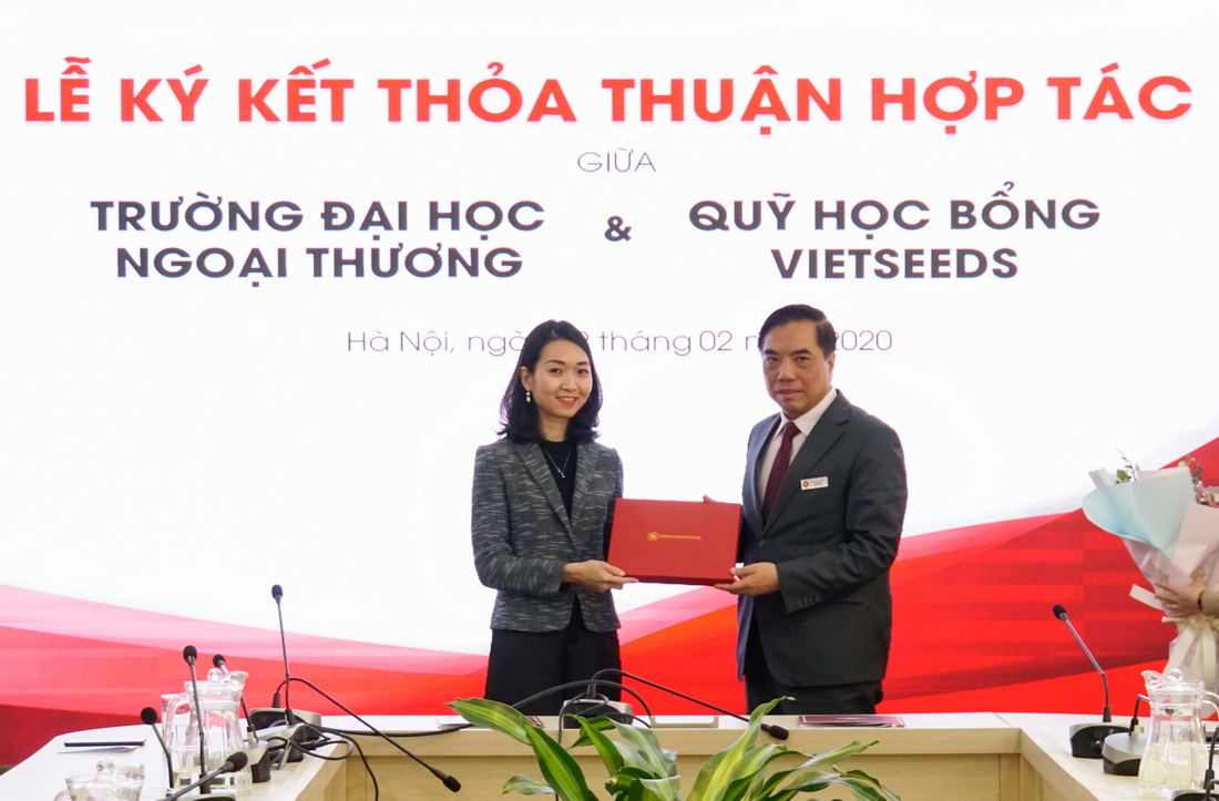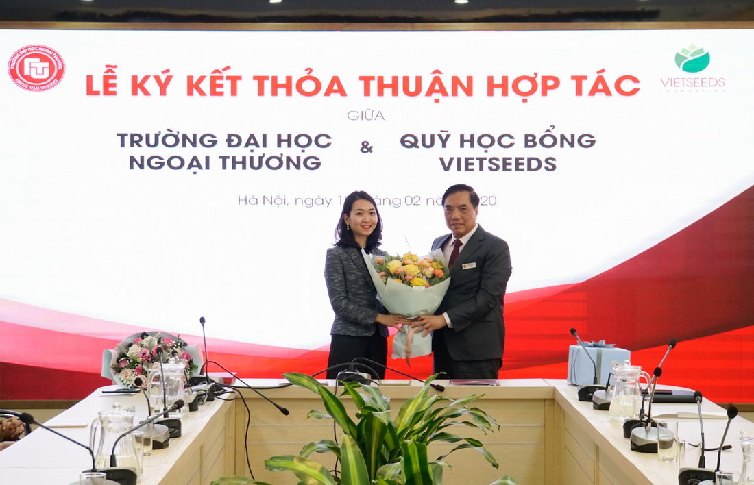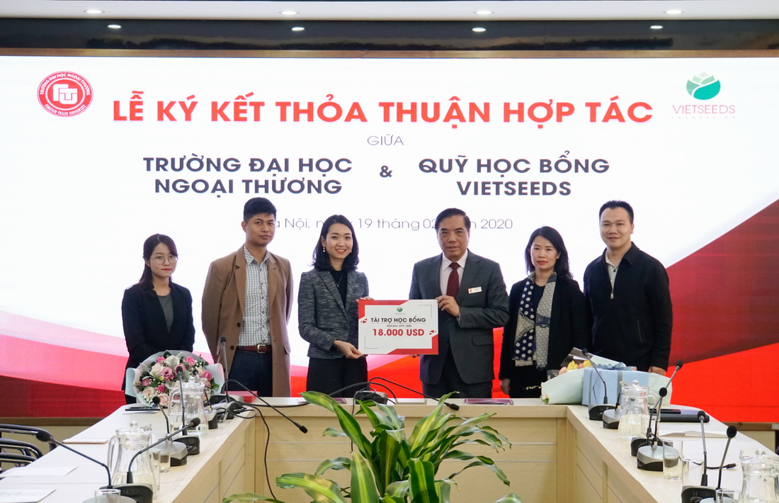 Trong không khí của những ngày đầu tiên của năm mới Canh Tý, ngày 19/02/2020, Nhà trường vô cùng vui mừng khi mạng lưới hợp tác doanh nghiệp, tổ chức của Trường Đại học Ngoại thương lại được mở rộng khi có sự đồng hành của Quỹ Học bổng Vietseeds. Tham dự lễ ký kết thỏa thuận hợp tác, về phía Quỹ học bổng Vietseeds có Bà Huyền Tôn Nữ Cát Tường - Tổng giám đốc cùng các cán bộ, nhân viên của Quỹ. Về phía Trường Đại học Ngoại thương có PGS, TS Bùi Anh Tuấn - Hiệu trưởng, PGS, TS Đào Thị Thu Giang - Phó Hiệu trưởng, PGS, TS Phạm Thu Hương - Phó Hiệu trưởng cùng các thầy cô giáo là lãnh đạo các đơn vị trong toàn trường và các bạn sinh viên được nhận học bổng Vietseeds.
