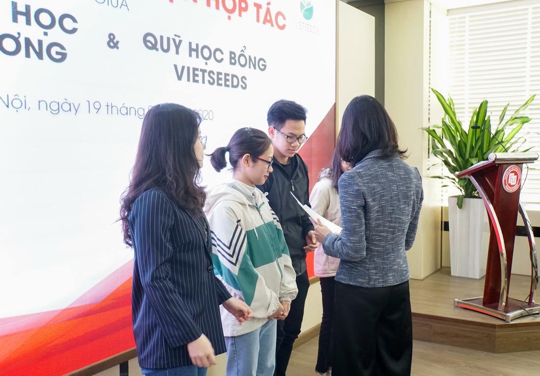 Phát biểu tại buổi lễ, PGS, TS Bùi Anh Tuấn bày tỏ vui mừng khi trong những ngày đầu của năm mới được cùng với Quỹ học bổng Vietseeds ký kết thỏa thuận hợp tác toàn diện với phạm vi hợp tác sâu rộng và hình thức triển khai đa dạng từ trao học bổng cho những sinh viên tiềm năng có hoàn cảnh khó khăn của Trường Đại học Ngoại thương; Phối hợp tổ chức các chương trình hội thảo về kỹ năng, gặp gỡ các nhân vật có tầm ảnh hưởng và truyền cảm hứng cho sinh viên cho đến phối hợp triển khai hoạt động mentoring (người cố vấn) cho cán bộ, giảng viên, sinh viên, cựu sinh viên và các tổ chức, doanh nghiệp đối tác của Trường Đại học Ngoại thương... Thầy cũng đặc biệt đánh giá cao mô hình mentoring kết nối cựu sinh viên với sinh viên của Vietseeds và hy vọng rằng mô hình này sẽ được triển khai hiệu quả trong khuôn khổ hợp tác giữa hai bên. Trước mắt, trong năm 2020, hai bên có kế hoạch phối hợp triển khai các hoạt động gồm: Chương trình Mentoring; Chương trình University talk và Cuộc thi HSBC Business Case Competition. Cuối cùng, Thầy cũng gửi lời chúc mừng tốt đẹp nhất tới 12 sinh viên được nhân Học bổng Vietseeds trong năm học này và mong rằng các bạn sẽ là những nhân tố truyền cảm hứng cho các bạn sinh viên FTU.