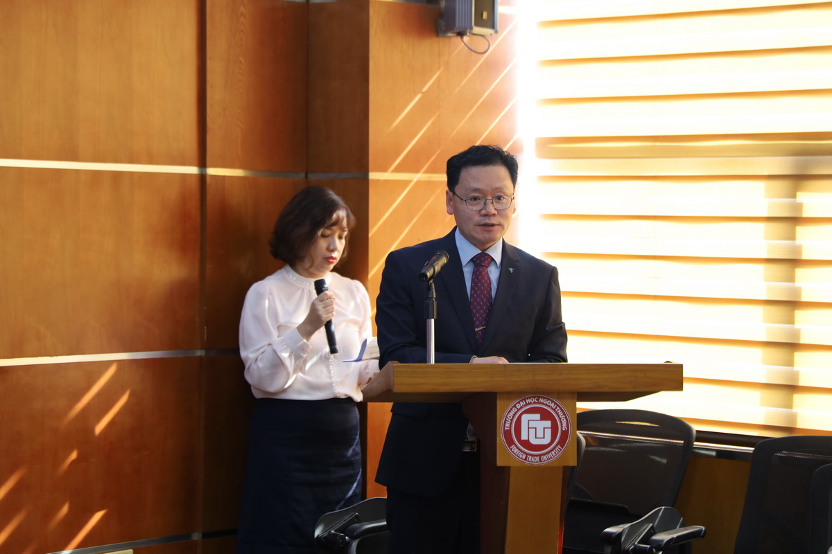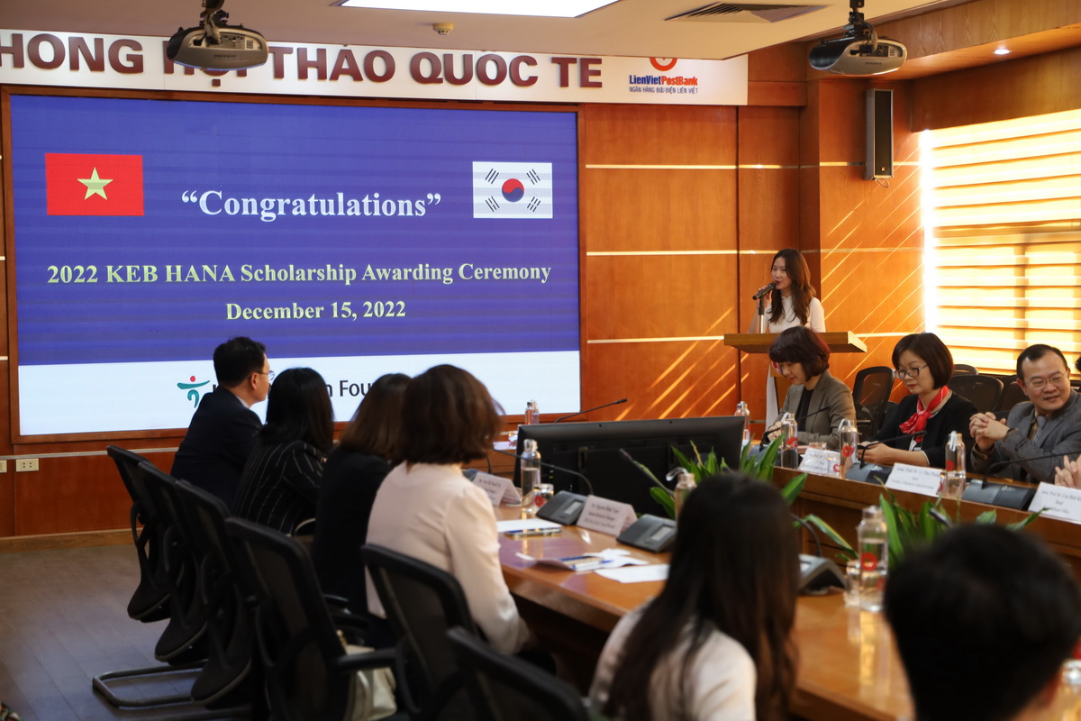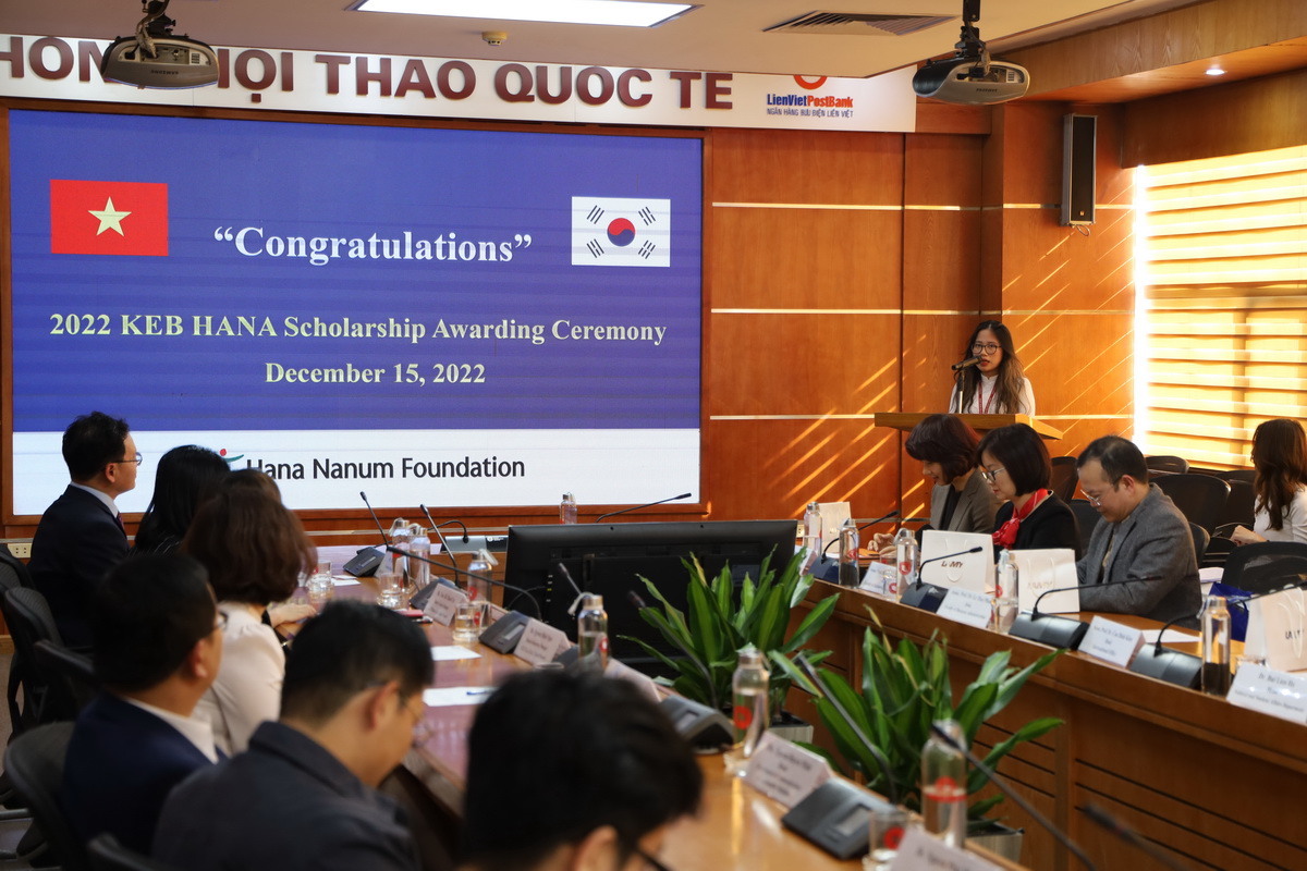 Phát biểu tại buổi lễ, PGS, TS Phạm Thu Hương gửi lời cảm ơn chân thành nhất tới sự hỗ trợ của Quỹ tài trợ Hana Nanum và Ngân hàng KEB Hana. Ngân hàng KEB Hana và Trường ĐH Ngoại thương đã có nhiều năm hợp tác, tính đến nay, 250 sinh viên của Nhà trường đã nhận được hỗ trợ tài chính từ học bổng Ngân hàng KEB Hana. Việc trao tặng các suất học bổng không chỉ là sự trợ giúp về mặt tài chính mà còn là nguồn động viên to lớn, giúp các bạn sinh viên có động lực trong học tập và tham gia tích cực các hoạt động ngoại khoá và mong muốn sự hợp tác giữa hai đơn vị sẽ tiếp tục phát triển tốt đẹp trong thời gian sắp tới.