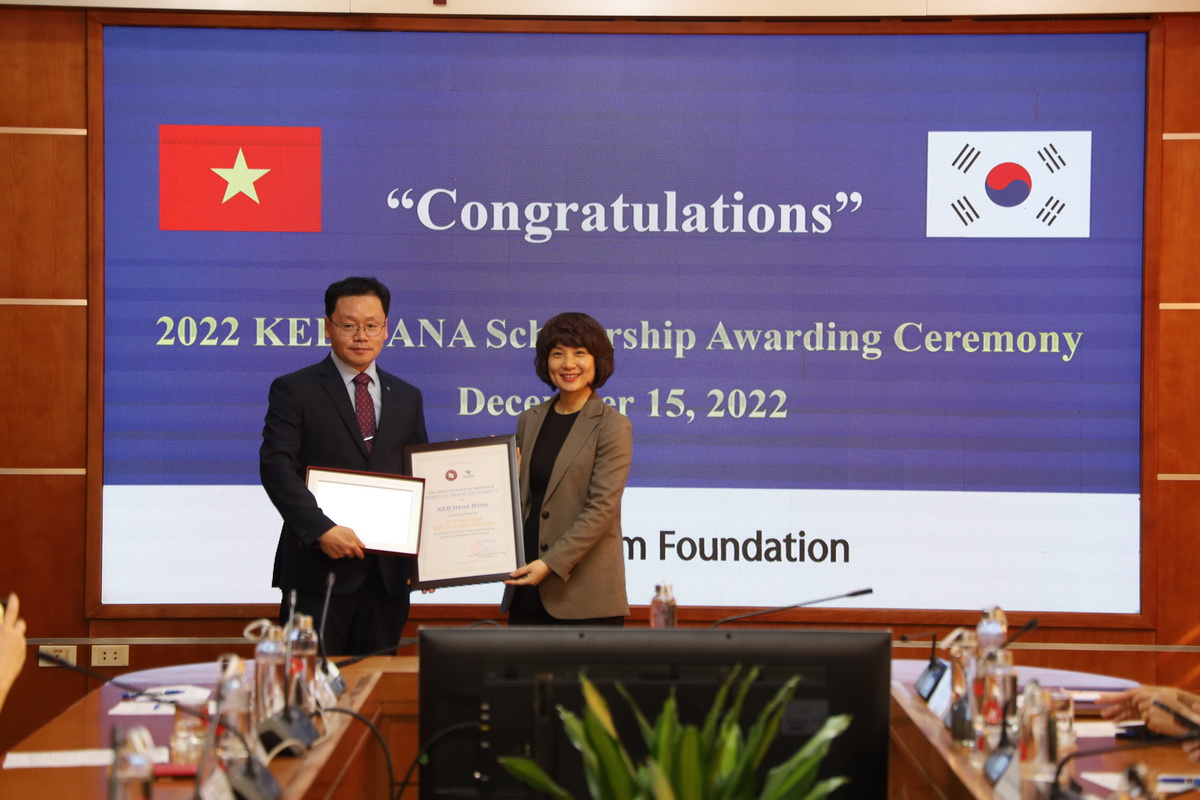 Ngày 15/12/2022, tại Trường ĐH Ngoại thương, Khoa Kế toán Kiểm toán đã phối hợp cùng Khoa Quản trị kinh doanh tổ chức Lễ trao học bổng của Ngân hàng KEB Hana (Hàn Quốc) năm 2022 cho 25 sinh viên có hoàn cảnh khó khăn đạt kết quả học tập tốt và sinh viên có kết quả học tập xuất sắc của hai Khoa.