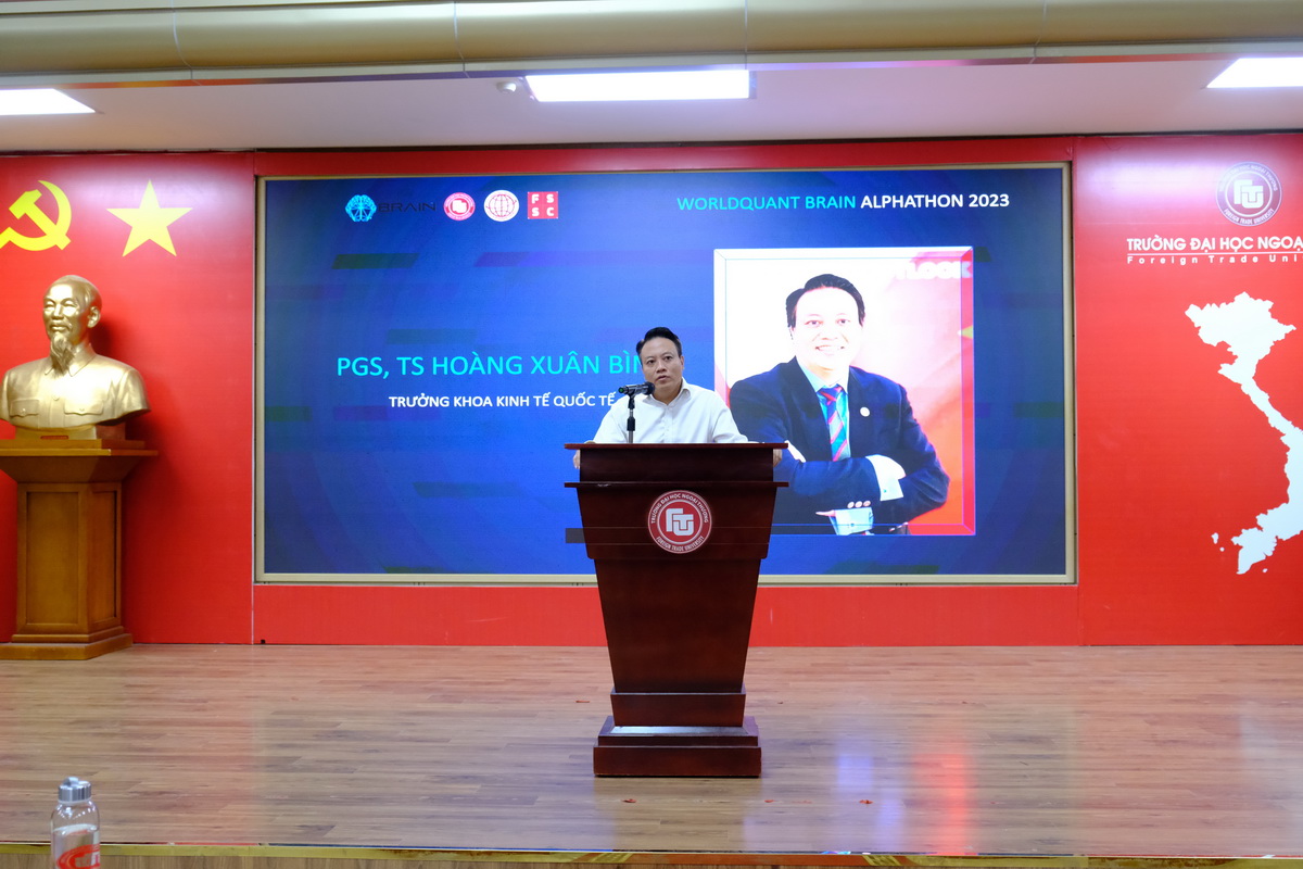 Phát biểu khai mạc Chương trình, PGS, TS Đào Ngọc Tiến đã nhấn mạnh: Hệ sinh thái đào tạo về lĩnh vực Công nghệ thông tin, Khoa học dữ liệu đã và đang được Nhà trường tiếp tục xây dựng và mở rộng. Các cuộc thi liên quan đến ngành Khoa học dữ liệu trong kinh tế, kinh doanh ngày càng được nở rộ, điển hình như Cuộc thi Tìm kiếm Tài năng Khoa học dữ liệu - một sân chơi uy tín được trường ĐH Ngoại thương khởi động mùa đầu tiên vào năm 2022 thu hút hơn 100 đội thi tham dự; hay thành công của các đội thi đến từ trường ĐH Ngoại thương trong cuộc thi International Quant Championship do WorldQuant tổ chức vào tháng 4/2023 với 3/8 đội vào chung kết đến từ FTU trong đó có 01 đội đạt giải Nhì Quốc gia. Chính vì vậy, WorldQuant Brain’s FTU Alphathon 2023 hứa hẹn là sân chơi bổ ích, thường niên dành cho các em sinh viên Trường ĐH Ngoại thương. PGS, TS Đào Ngọc Tiến cũng gửi lời chúc đến tất cả các thí sinh tham gia cuộc thi, đồng thời gửi lời cảm ơn đến WorldQuant Việt Nam đã phối hợp với Trường ĐH Ngoại thương tổ chức chương trình ý nghĩa này.