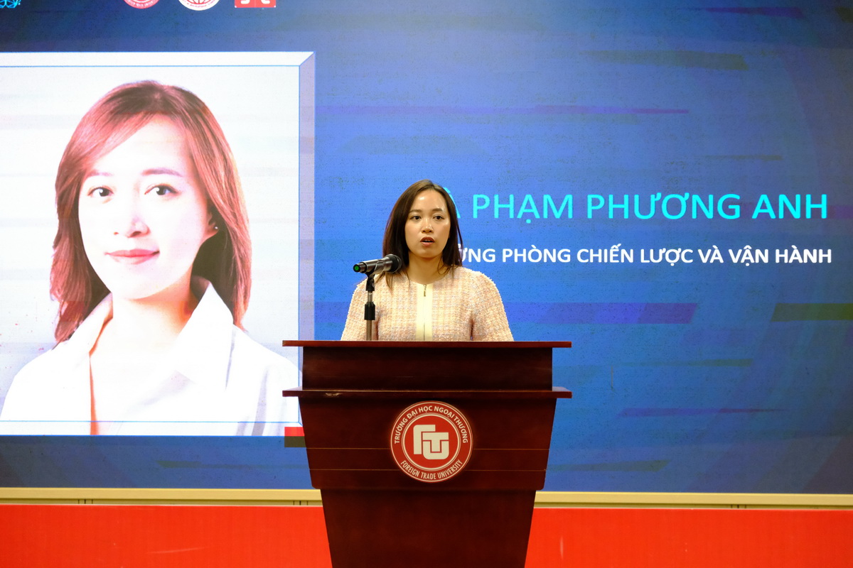 Chương trình tiếp nối với phần chia sẻ của đại diện Khoa Kinh tế quốc tế - PGS, TS Hoàng Xuân Bình cùng đại diện của WorldQuant Brain - bà Phạm Phương Anh. Qua đó, các bạn sinh viên đã được tìm hiểu về cuộc thi WorldQuant Brain’s FTU Alphathon 2023, cuộc thi trực tuyến về xây dựng mô hình tài chính định lượng. Đây được xem là một ngành khá mới tại Việt Nam, tuy nhiên hứa hẹn mang lại cơ hội lớn không chỉ riêng với các bạn sinh viên mà còn với những người đam mê trong lĩnh vực Tài chính định lượng nói chung. Thông qua cuộc thi, các sinh viên có cơ hội sử dụng dữ liệu lịch sử thị trường và các toán tử được xác định trước trên nền tảng WorldQuant BRAIN để mô phỏng các trạng thái giao dịch của cổ phiếu, gán trọng số cho chứng khoán dựa trên dự đoán lợi nhuận kỳ vọng trong khoảng thời gian xác định tiếp theo.