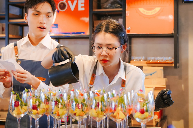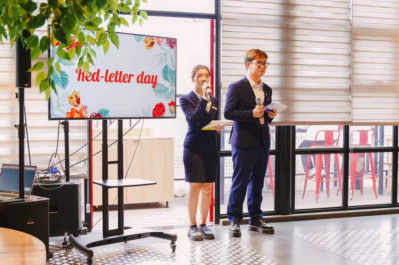 Điều đặc biệt của "Red-letter Day" chính là phong cách trà chiều (low-tea), có nguồn gốc từ nước Anh thế kỉ 19. Tại đây các bạn sinh viên trong vai trò nhân viên tại một nhà hàng tiêu chuẩn quốc tế 5 sao đã đảm nhận vô cùng chuyên nghiệp các vị trí trong nhà hàng như Quản lý nhà hàng, Nhân viên điều phối, Nhân viên chạy món, Nhân viên pha chế… Khoác trên mình bộ đồng phục QTKS, các em sinh viên đã thể hiện được một tác phong chuyên nghiệp, tinh thần hiếu khách và trách nhiệm cao trong buổi báo cáo thực hành.