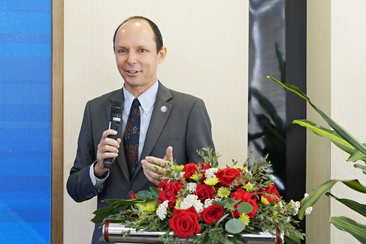 Phát biểu tại buổi nói chuyện, PGS, TS Đào Ngọc Tiến nhiệt liệt chào mừng Ngài tham tán Kinh tế, ĐSQ Hoa Kỳ tại Việt Nam đến trao đổi và có bài nói chuyện với sinh viên Nhà trường nhân dịp 25 năm bình thường hóa quan hệ giữa 2 nước. Thầy cho biết chặng đường 25 năm từ 2 bờ chiến tuyến trong chiến tranh trở thành đối tác toàn diện là một quá trình vượt qua rất nhiều khó khăn, trở ngại để đi đến thành công ngày hôm nay. Quan hệ ngày càng tốt đẹp giữa 2 nước là minh chứng sống động cho việc gác lại quá khứ và cùng nhau kiến tạo một tương lai tươi sáng cho cả 2 quốc gia. Quan hệ giữa Việt Nam và Hoa Kỳ trải dài trên nhiều lĩnh vực hợp tác, trong đó nổi bật nhất phải nói đến hợp tác về kinh tế và giáo dục. Trường ĐHNT với vai trò là một trong số những cơ sở giáo dục đại học đi tiên phong trong hợp tác quốc tế, trong đó không thể không kể đến việc hợp tác với nhiều trường đại học, doanh nghiệp, tổ chức đối tác của Hoa Kỳ trên nhiều mặt từ xây dựng và triển khai các chương trình đào tạo liên kết, chuyển tiếp, trao đổi sinh viên, giảng viên, trao đổi học thuật cho đến hợp tác trong tuyển dụng, thực tập, các chương trình giao lưu văn hóa cho sinh viên... Tất cả những kết quả đạt được đều rất đáng ghi nhận. Thầy bày tỏ mong muốn sẽ được phía ĐSQ Hoa Kỳ tạo điều kiện hơn nữa để Nhà trường có thể mở rộng thêm nhiều cơ hội hợp tác mới với các đối tác Hoa Kỳ nhằm làm sâu sắc hơn, đem lại giá trị và hiệu quả cao hơn nữa cho giáo dục của cả 2 quốc gia.