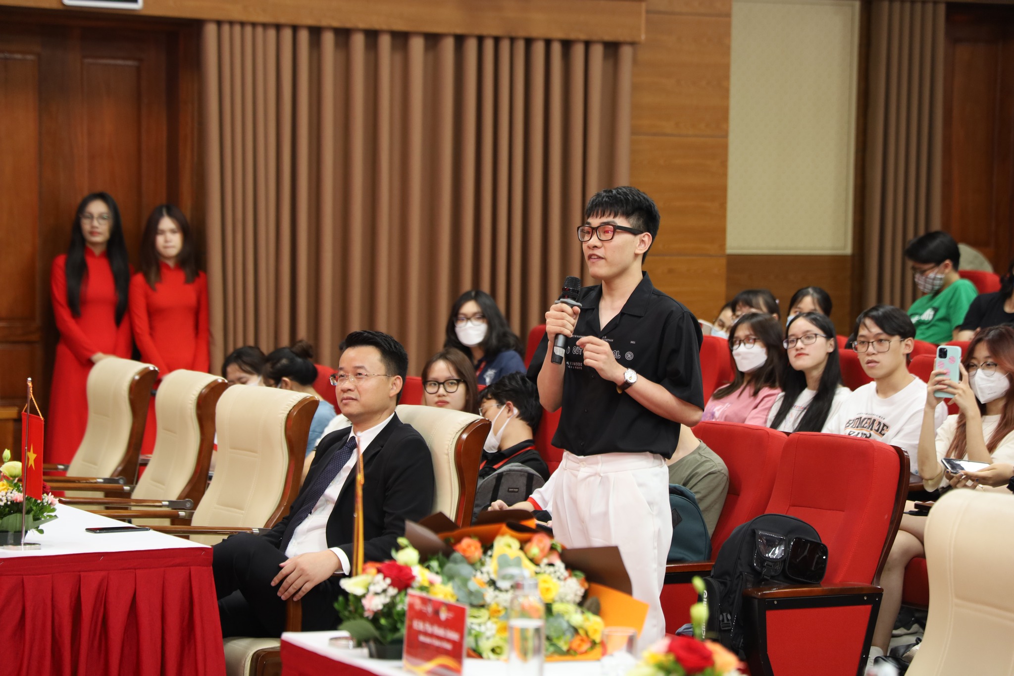 Sau bài giảng, bà Đại sứ và ông Trưởng đại diện đã trao đổi, giao lưu với sinh viên về việc học tiếng Tây Ban Nha, du học Tây Ban Nha, bóng đá và thể thao Tây Ban Nha.