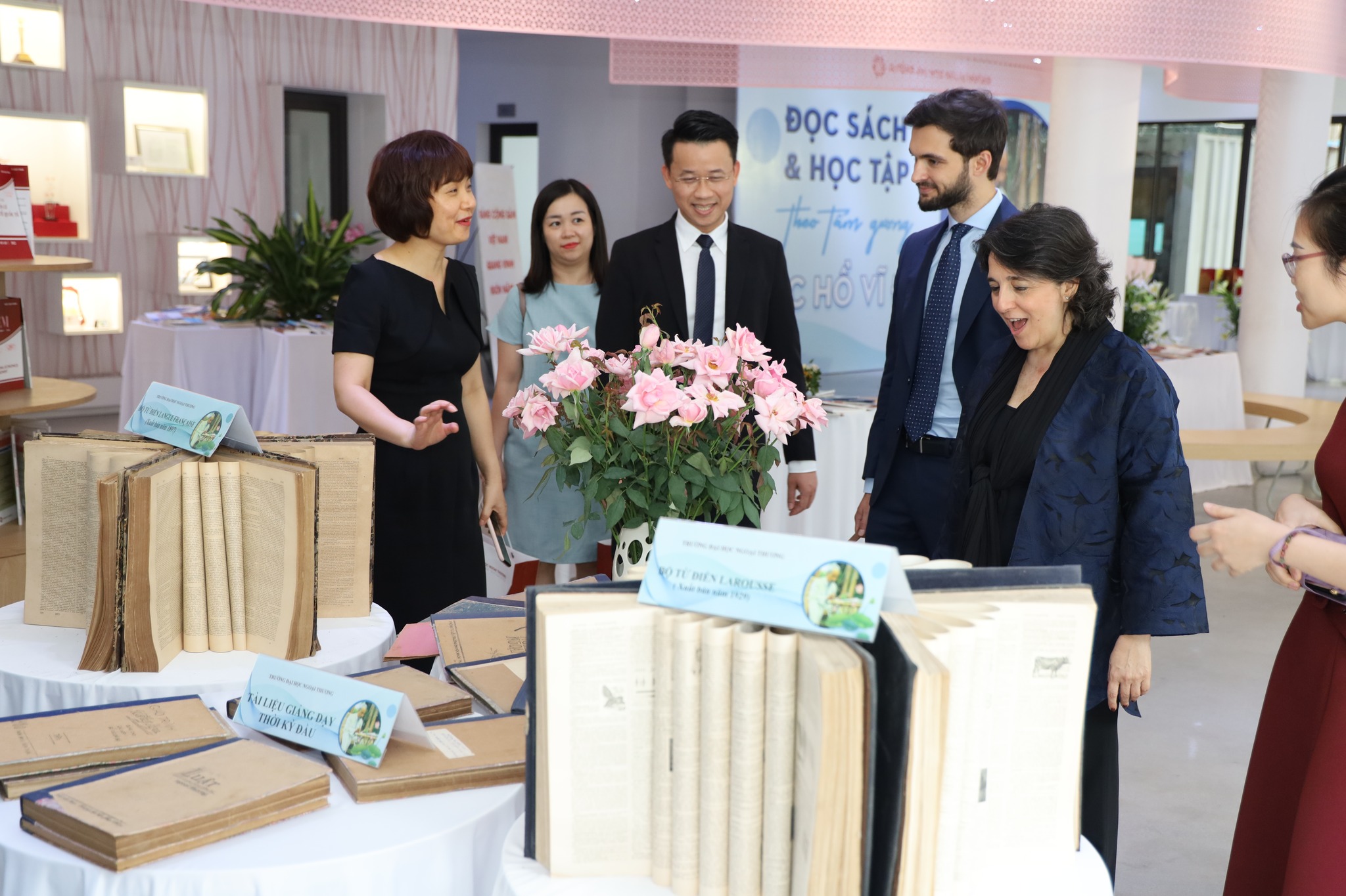 Nhân dịp này, bà Đại sứ và ông Trưởng đại diện đã tham quan khu Trưng bày sách chào mừng 132 năm ngày sinh Chủ tịch Hồ Chí Minh và bày tỏ sự ấn tượng với những đầu sách quý, đa dạng được lưu giữ tại Thư viện cũng như những ấn phẩm do Nhà trường xuất bản.